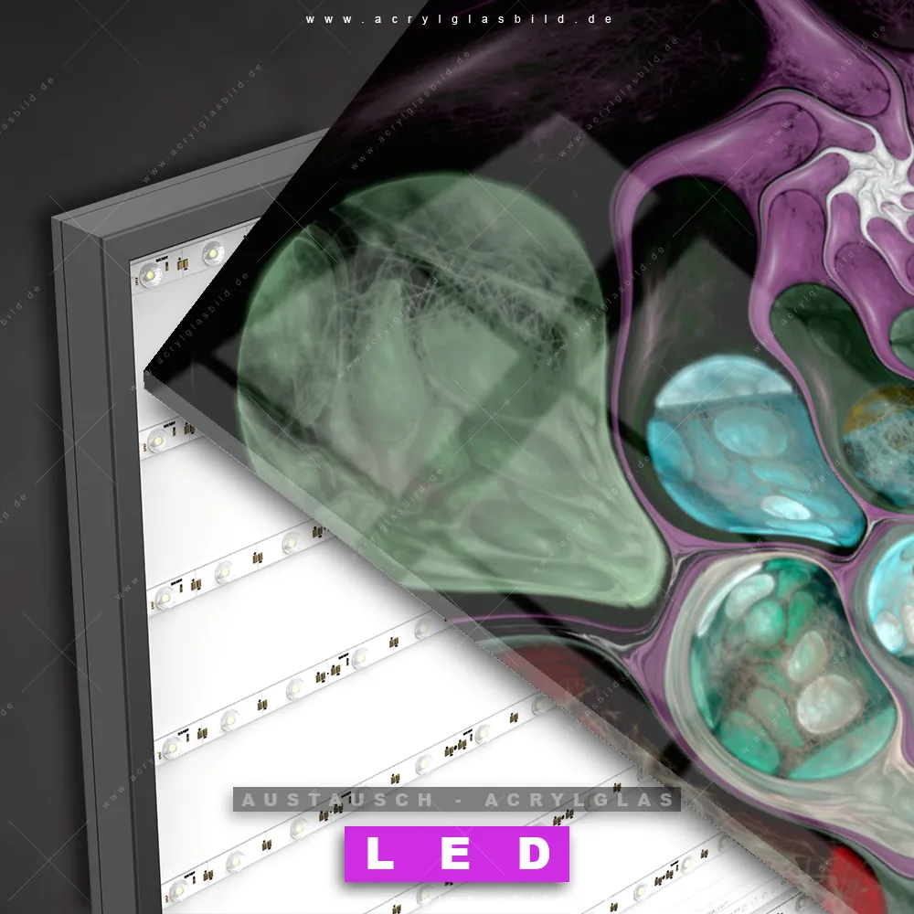 Begriffe wie dynamisch, Grafik, Fraktal, digital, kreativ, Kunst, Kreis, Licht, Blasen, Energie haben dich auf der Suche nach deinem neuen Austausch-Acrylglasbild inspiriert? Dann sollte das Wechsel-Acrylglasbild runde Formenvielfalt für dein bereits vorhandenes LED Acrylglasbild Canvalight® DIA den Weg zu dir finden.