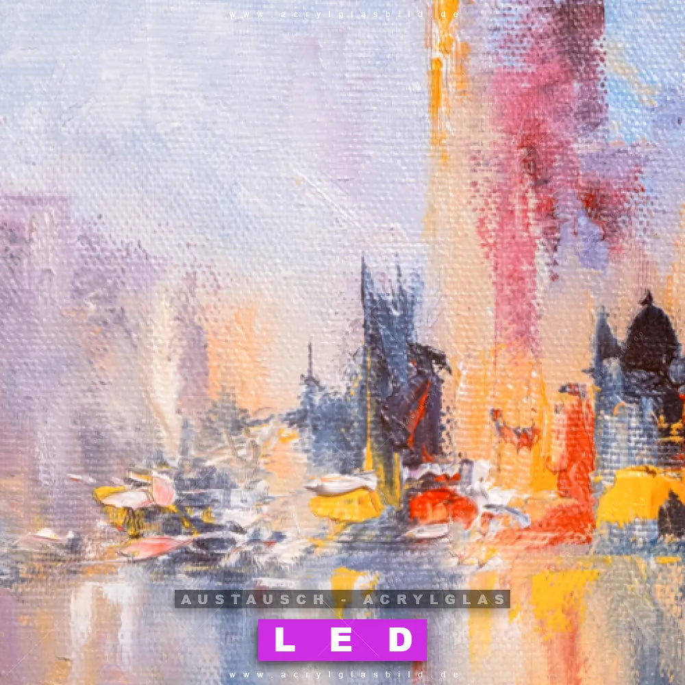 Begriffe wie Skyline, Metropole, Häuser, Wolkenkratzer, Hochhäuser, Stadt, City, Kunst, Malerei haben dich auf der Suche nach deinem neuen Austausch-Acrylglasbild inspiriert? Dann sollte das Wechsel-Acrylglasbild Bunte Skyline-Malerei für dein bereits vorhandenes LED Acrylglasbild Canvalight® DIA den Weg zu dir finden.