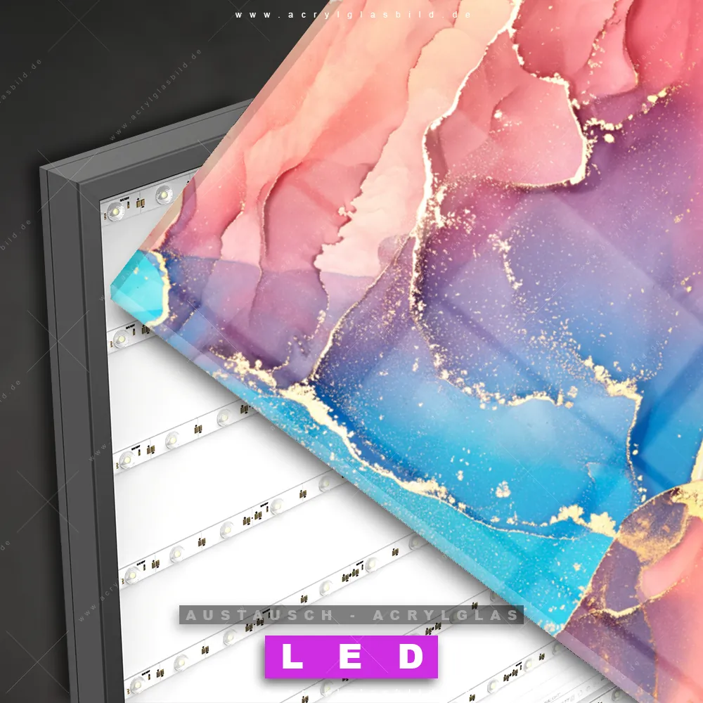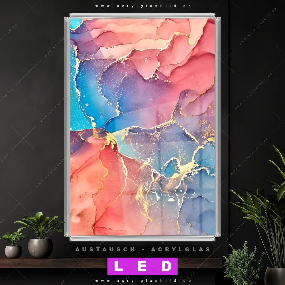 Begriffe wie Marmor, Flüssigkeit, Acryl, flüssig, Farbe, Marmorierung, Fluid Art haben dich auf der Suche nach deinem neuen Austausch-Acrylglasbild inspiriert? Dann sollte das Wechsel-Acrylglasbild verlaufende Farben mit Goldpuder für dein bereits vorhandenes LED Acrylglasbild Canvalight® DIA den Weg zu dir finden.