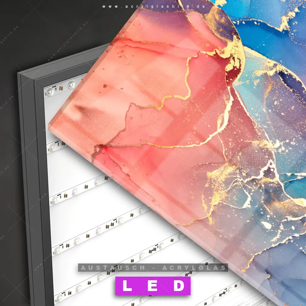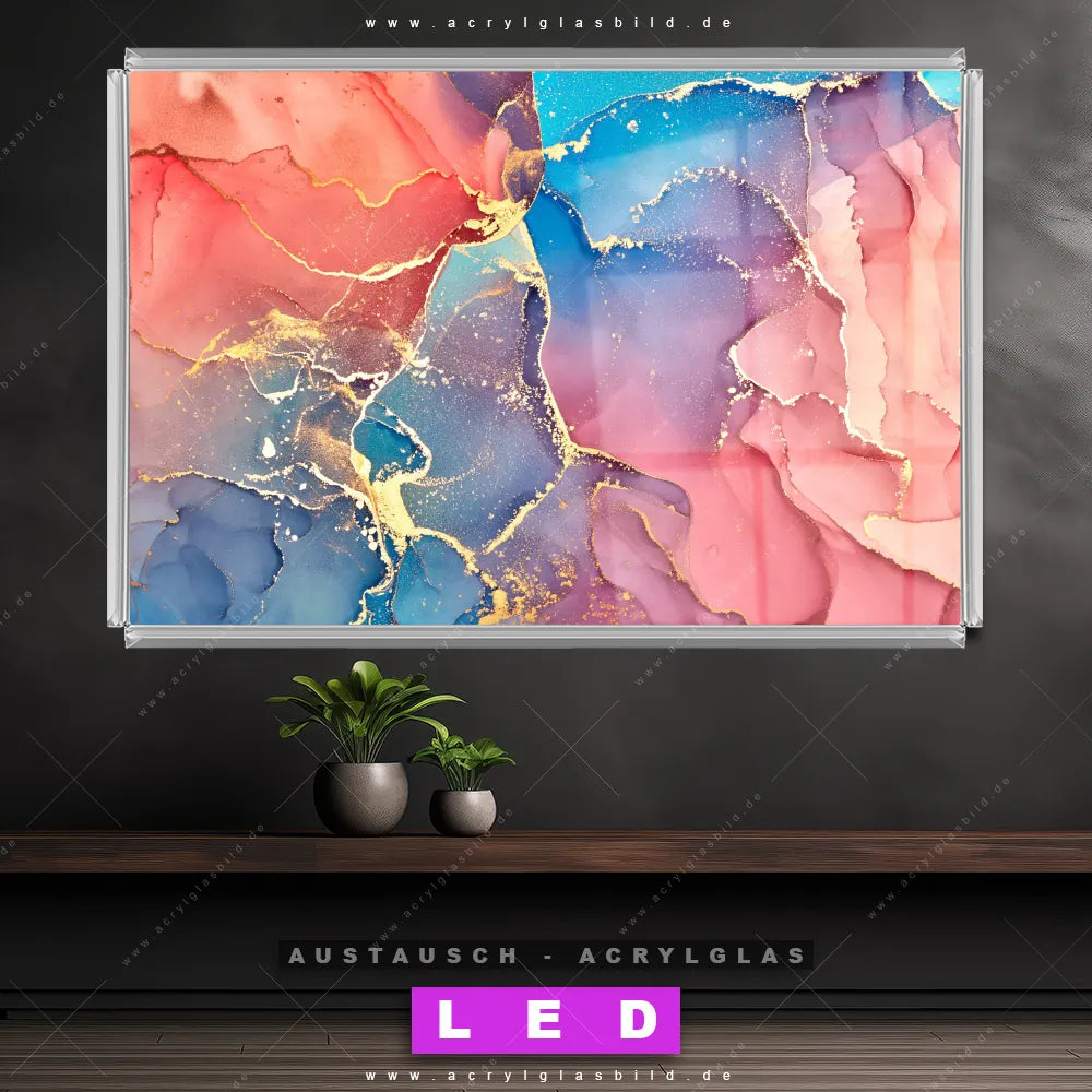 Begriffe wie Marmor, Flüssigkeit, Acryl, flüssig, Farbe, Marmorierung, Fluid Art haben dich auf der Suche nach deinem neuen Austausch-Acrylglasbild inspiriert? Dann sollte das Wechsel-Acrylglasbild verlaufende Farben mit Goldpuder für dein bereits vorhandenes LED Acrylglasbild Canvalight® DIA den Weg zu dir finden.