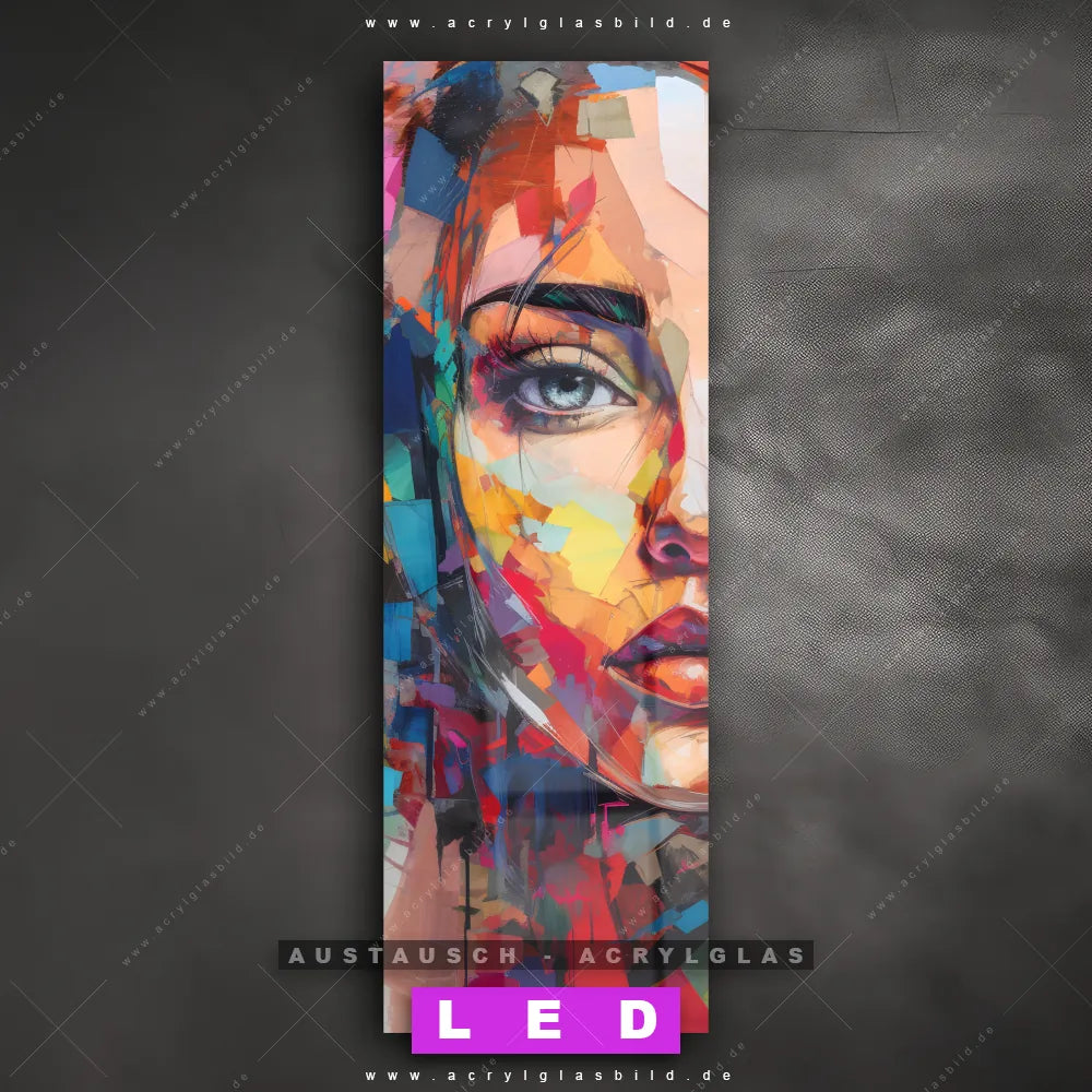 Begriffe wie Kunst, Frau, Portrait, Gesicht, Mädchen, Dame, Acryl, Schönheit, Farbe haben dich auf der Suche nach deinem neuen Austausch-Acrylglasbild inspiriert? Dann sollte das Wechsel-Acrylglasbild Bunte abstrakte Schönheit für dein bereits vorhandenes LED Acrylglasbild Canvalight® DIA den Weg zu dir finden.