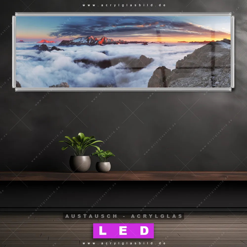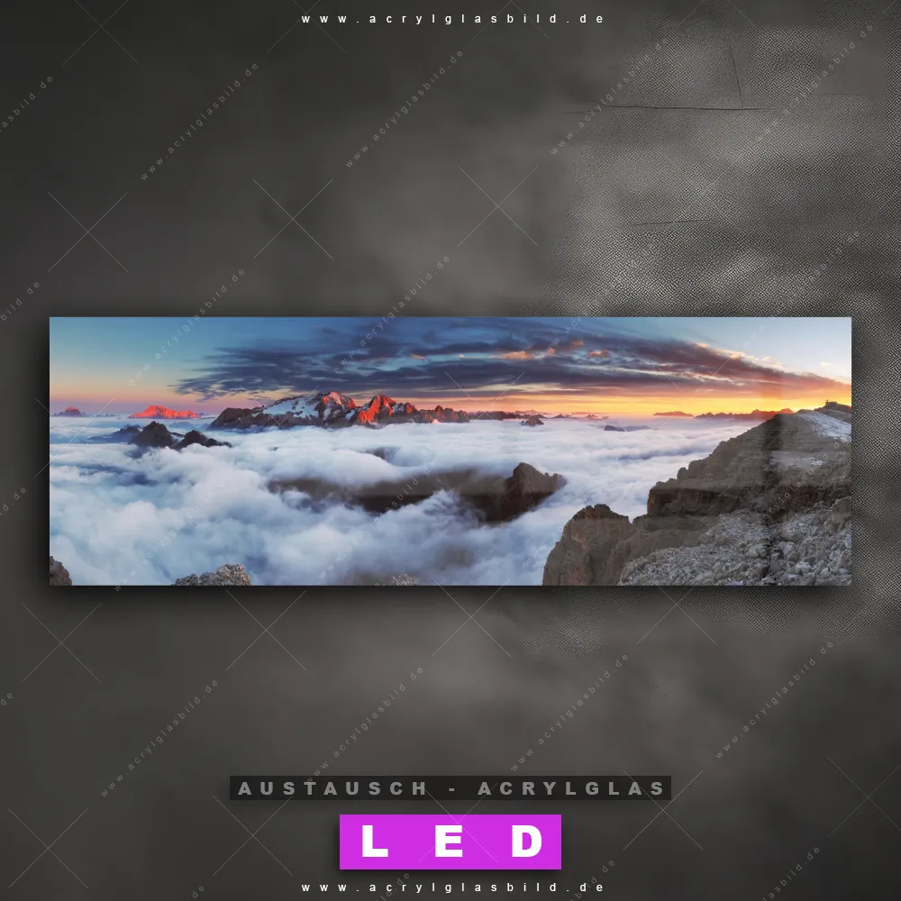 Begriffe wie Landschaft, Natur, Stille, Berge, Sonnenuntergang, Sonnenaufgang, Sonne, Gebirge, Nebel, Steine haben dich auf der Suche nach deinem neuen Austausch-Acrylglasbild inspiriert? Dann sollte das Wechsel-Acrylglasbild Bergspitzen für dein bereits vorhandenes LED Acrylglasbild Canvalight® DIA den Weg zu dir finden.