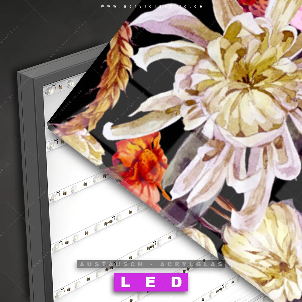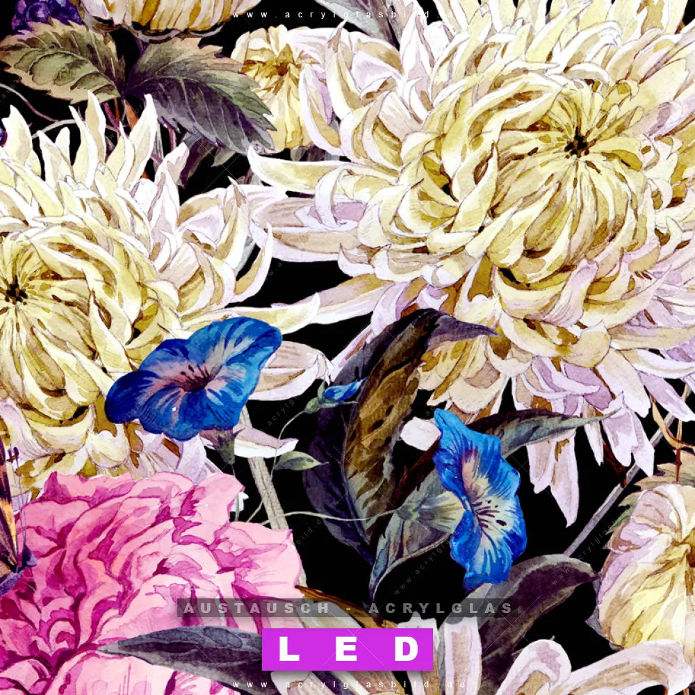 Begriffe wie Blume, Botanik, Pflanze, Natur, Aquarell, Wasserfarbe, Blumen, romantisch, Blüten, Bouquet, Blumenstrauß, Schmetterling haben dich auf der Suche nach deinem neuen Austausch-Acrylglasbild inspiriert? Dann sollte das Wechsel-Acrylglasbild Wildblumen für dein bereits vorhandenes LED Acrylglasbild Canvalight® DIA den Weg zu dir finden.