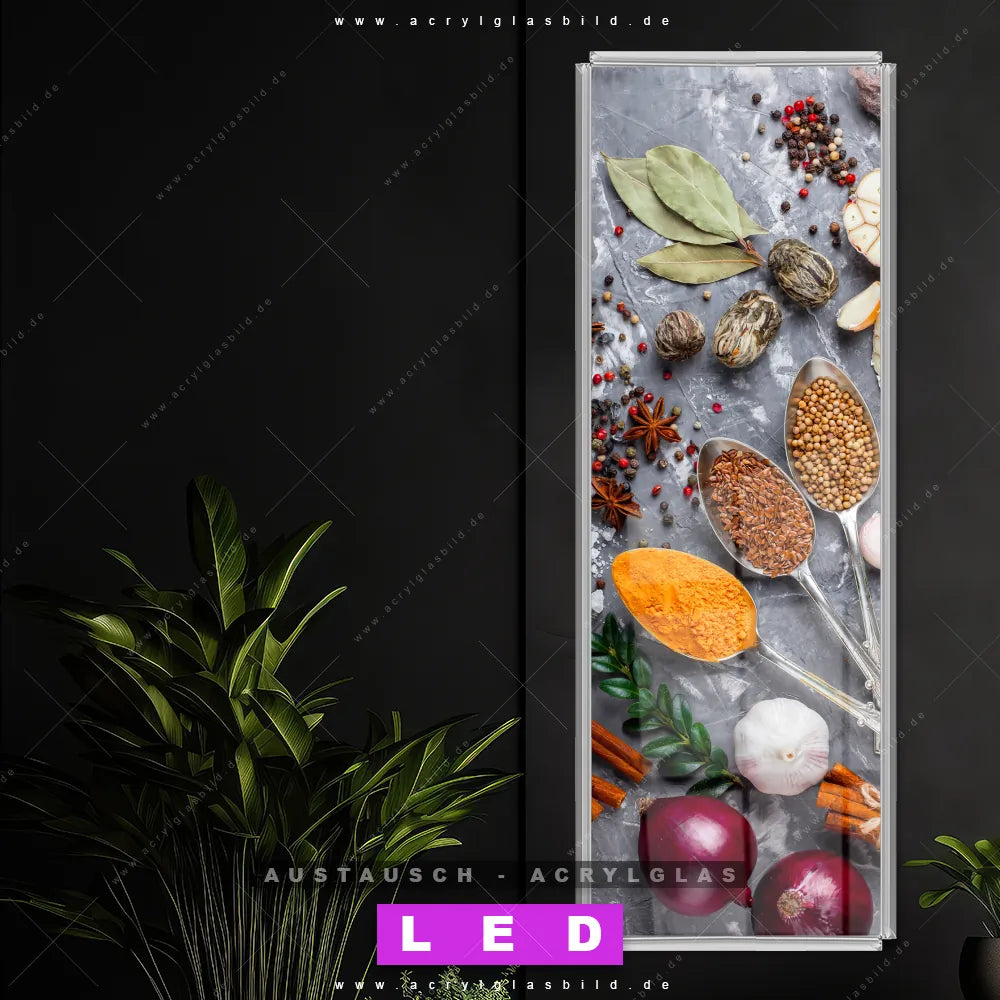 Begriffe wie Gewürze, Kräuter, kochen, Pfeffer, Curry, Küche, Lebensmittel, gesund, Essen, Löffel, Besteck haben dich auf der Suche nach deinem neuen Austausch-Acrylglasbild inspiriert? Dann sollte das Wechsel-Acrylglasbild intensive Gewürze für dein bereits vorhandenes LED Acrylglasbild Canvalight® DIA den Weg zu dir finden.