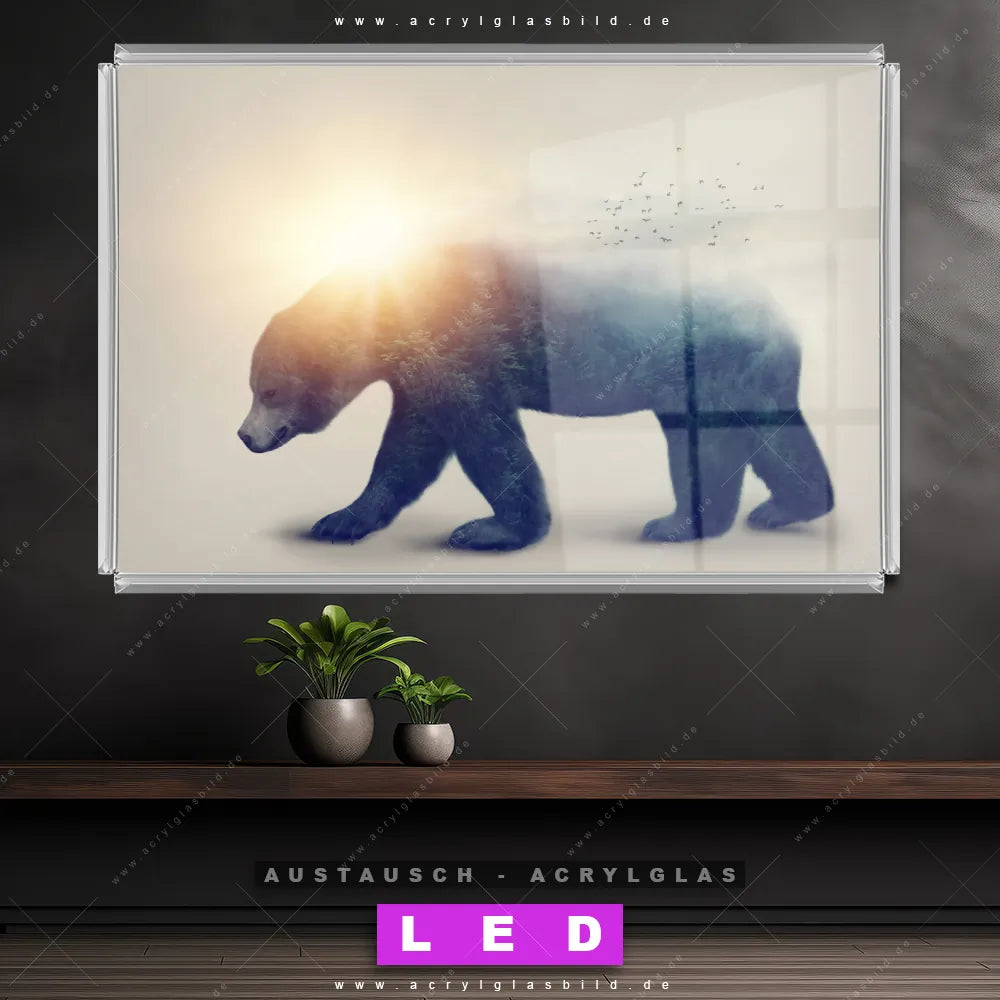 Begriffe wie Bär, Wald, Doppelbelichtung, Natur, skandinavisch, Bäume, Sonne, Sonnenlicht haben dich auf der Suche nach deinem neuen Austausch-Acrylglasbild inspiriert? Dann sollte das Wechsel-Acrylglasbild Bär mit Waldeffekten für dein bereits vorhandenes LED Acrylglasbild Canvalight® DIA den Weg zu dir finden.