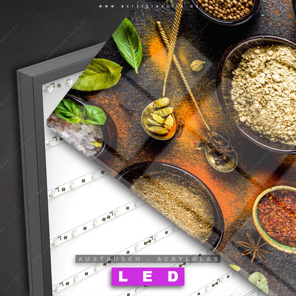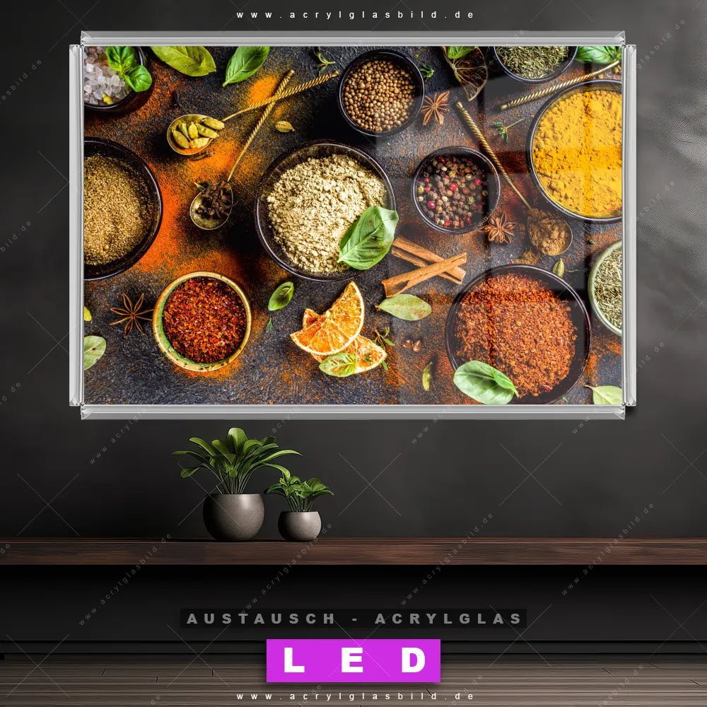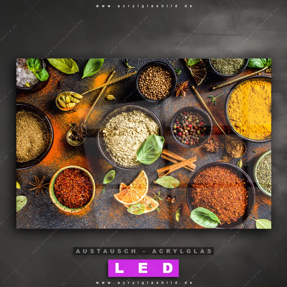Begriffe wie Gewürze, Kräuter, kochen, Chili, Pfeffer, Ingwer, Paprika, Küche, Essen, Lebensmittel haben dich auf der Suche nach deinem neuen Austausch-Acrylglasbild inspiriert? Dann sollte das Wechsel-Acrylglasbild verschiedene Gewürzschalen für dein bereits vorhandenes LED Acrylglasbild Canvalight® DIA den Weg zu dir finden.