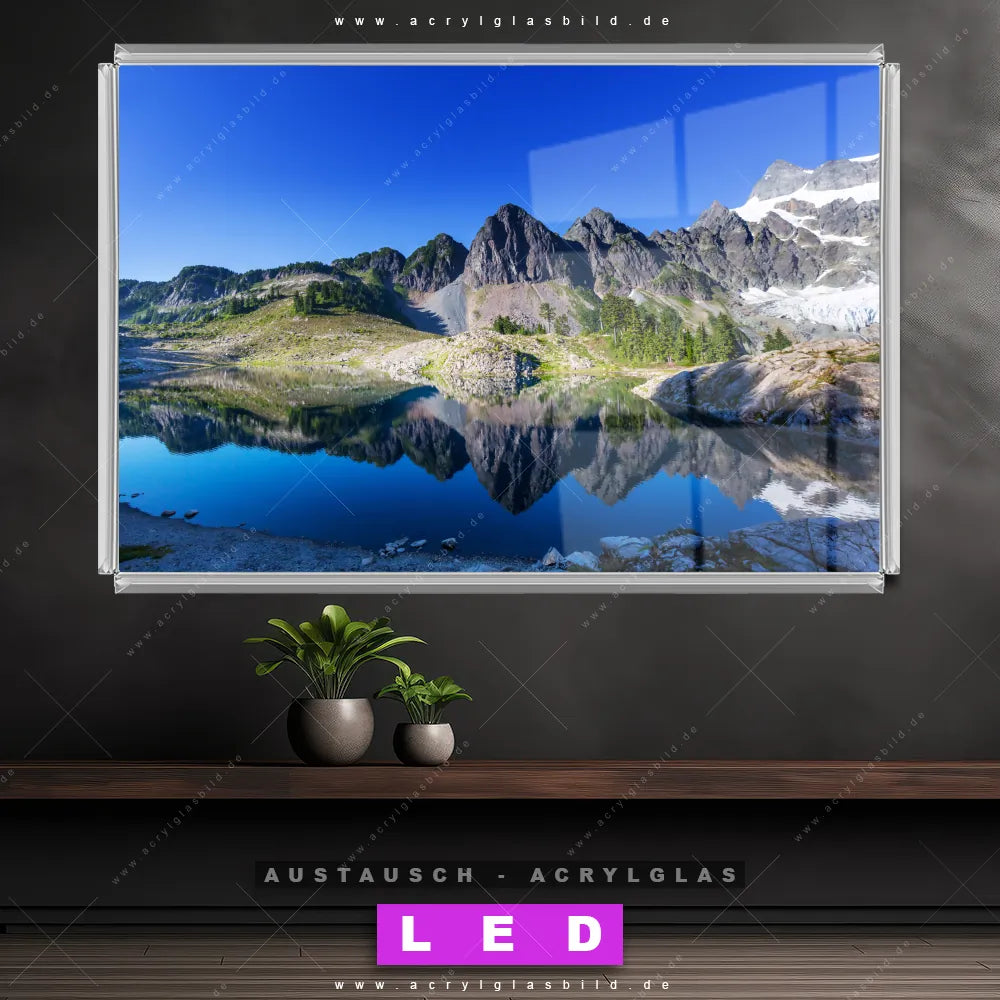 Begriffe wie Berge, Bergsee, See, Wasserspiegelung, Gebirge, Amerika, Washington, Bäume, Natur haben dich auf der Suche nach deinem neuen Austausch-Acrylglasbild inspiriert? Dann sollte das Wechsel-Acrylglasbild Amerikanischer See in Gebirge für dein bereits vorhandenes LED Acrylglasbild Canvalight® DIA den Weg zu dir finden.