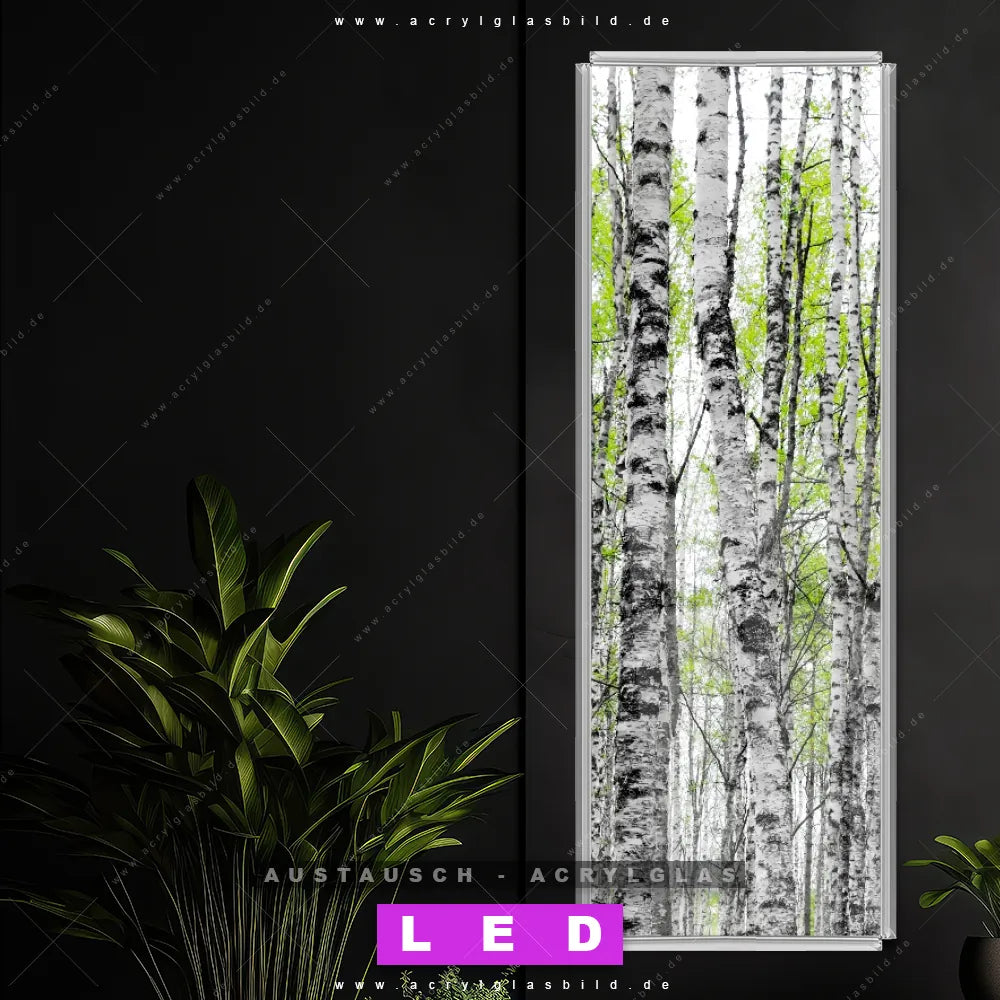 Begriffe wie Wald, Landschaft, Bäume, Natur, Birken, Ruhe, Stille haben dich auf der Suche nach deinem neuen Austausch-Acrylglasbild inspiriert? Dann sollte das Wechsel-Acrylglasbild Birkenstämme für dein bereits vorhandenes LED Acrylglasbild Canvalight® DIA den Weg zu dir finden.