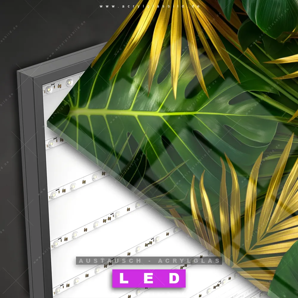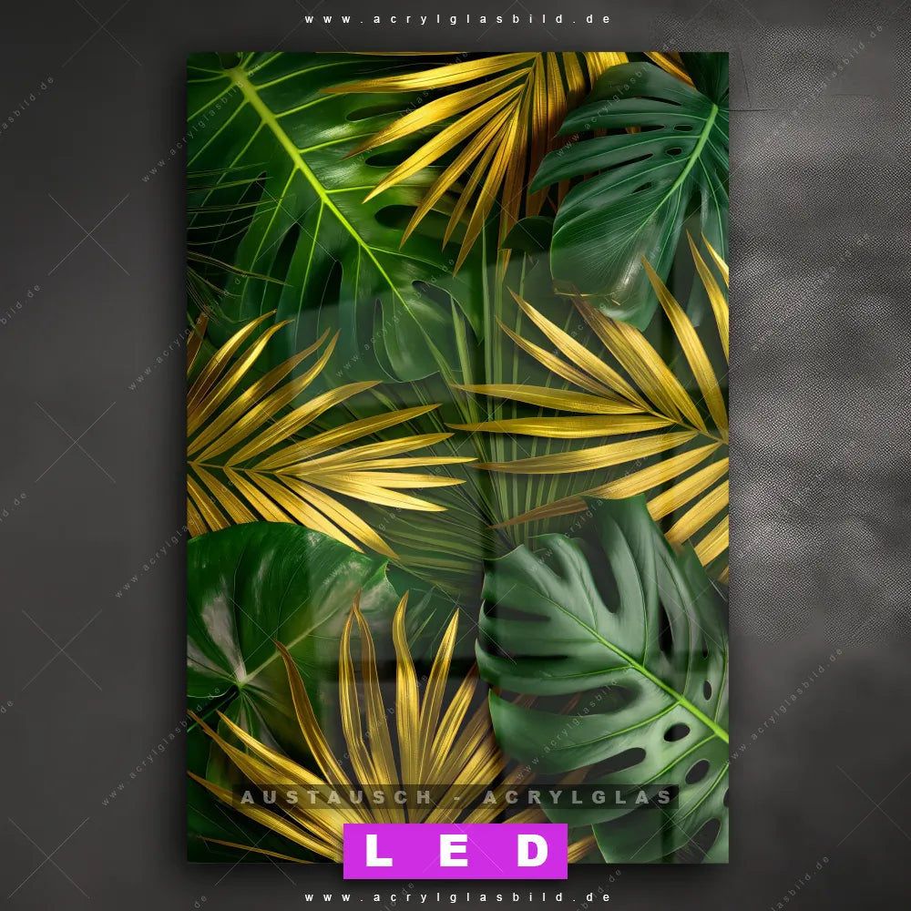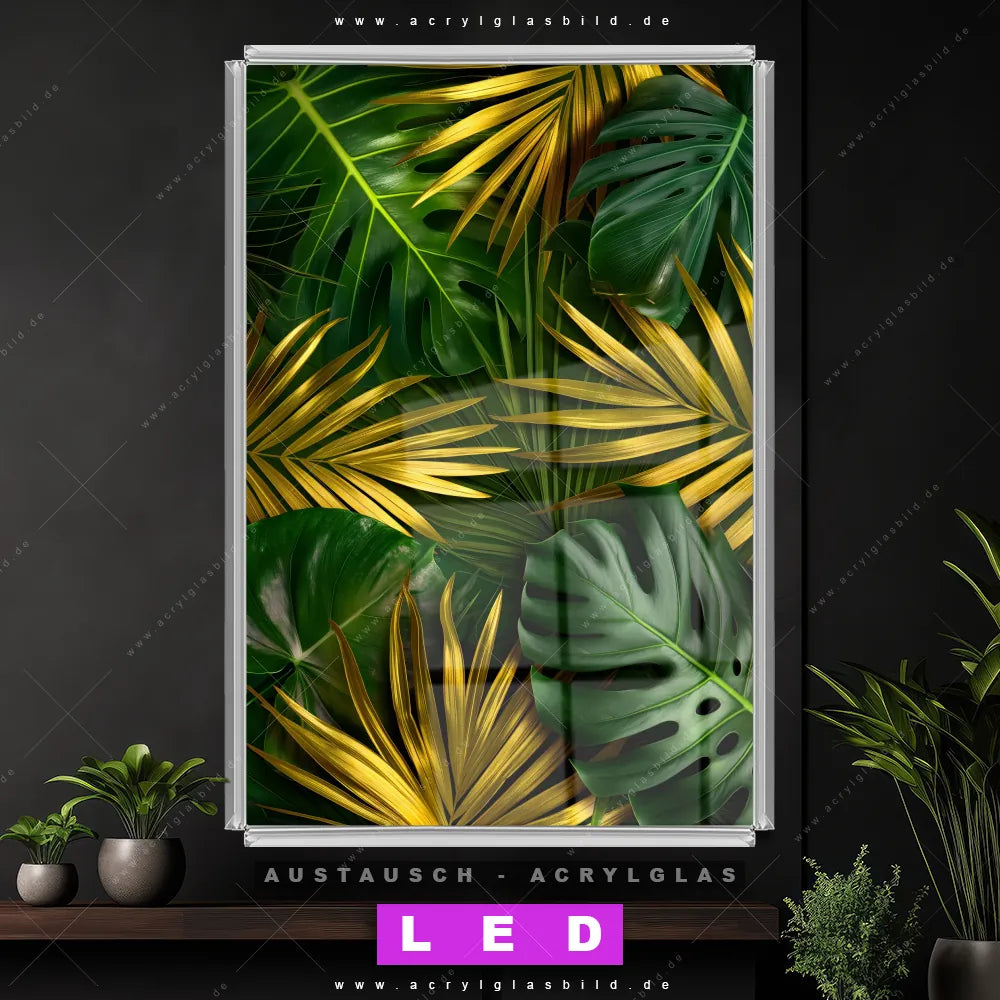 Begriffe wie Monstera, Palmenblätter, Blätter, Pflanze, Natur, Nahaufnahme, Laub, Dschungel haben dich auf der Suche nach deinem neuen Austausch-Acrylglasbild inspiriert? Dann sollte das Wechsel-Acrylglasbild Tropische Blätter in Gold für dein bereits vorhandenes LED Acrylglasbild Canvalight® DIA den Weg zu dir finden.