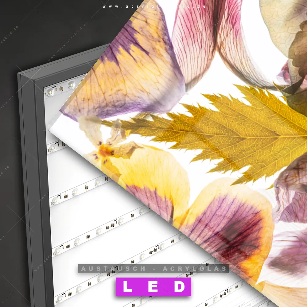 Begriffe wie Pflanze, Natur, Blüte, Nahaufnahme, Draufsicht, vintage, Blumen haben dich auf der Suche nach deinem neuen Austausch-Acrylglasbild inspiriert? Dann sollte das Wechsel-Acrylglasbild Blätter und Blüten für dein bereits vorhandenes LED Acrylglasbild Canvalight® DIA den Weg zu dir finden.