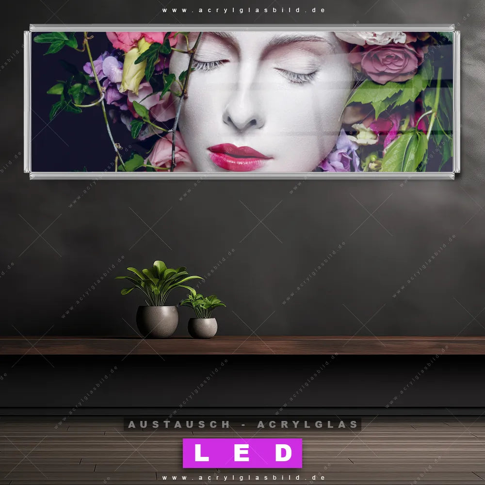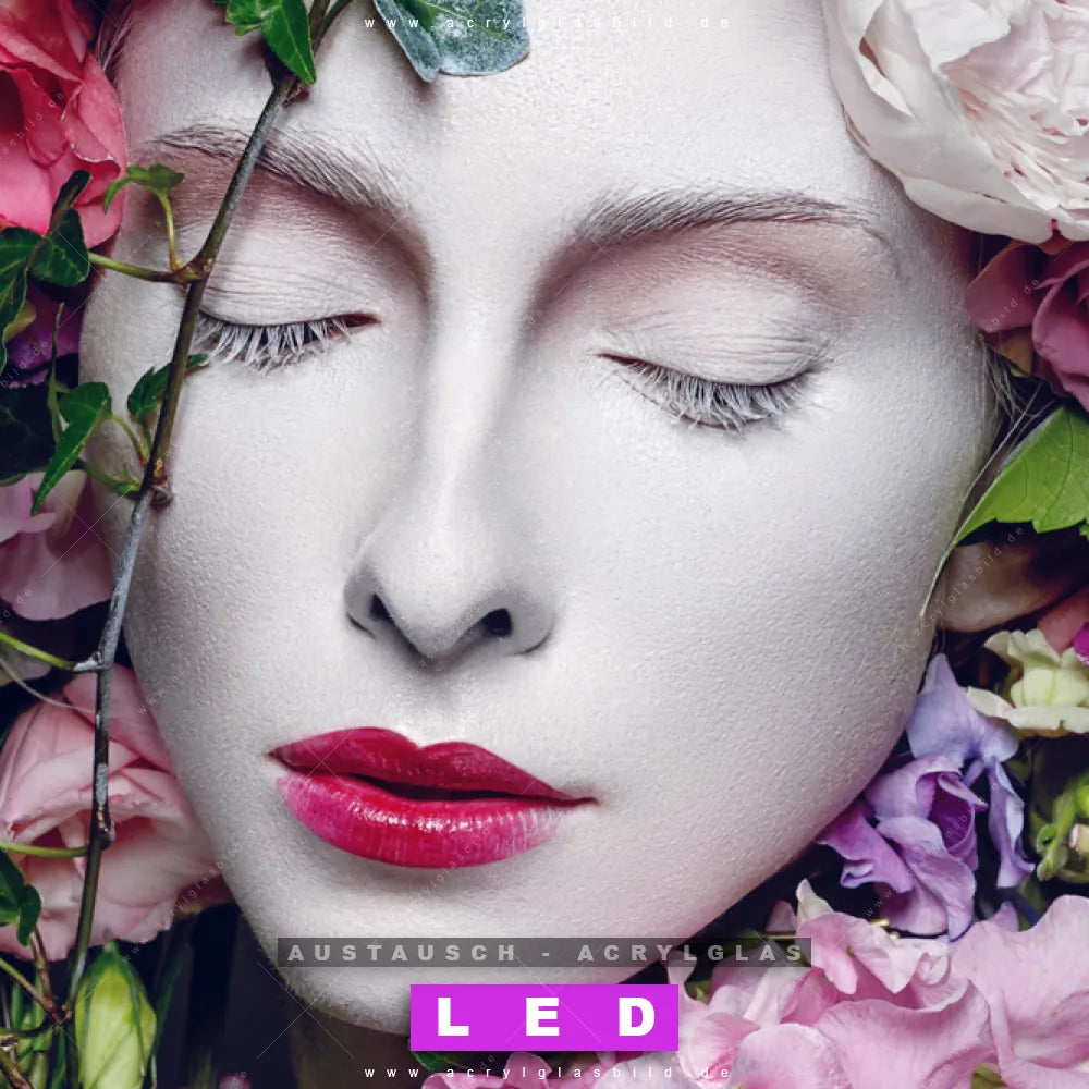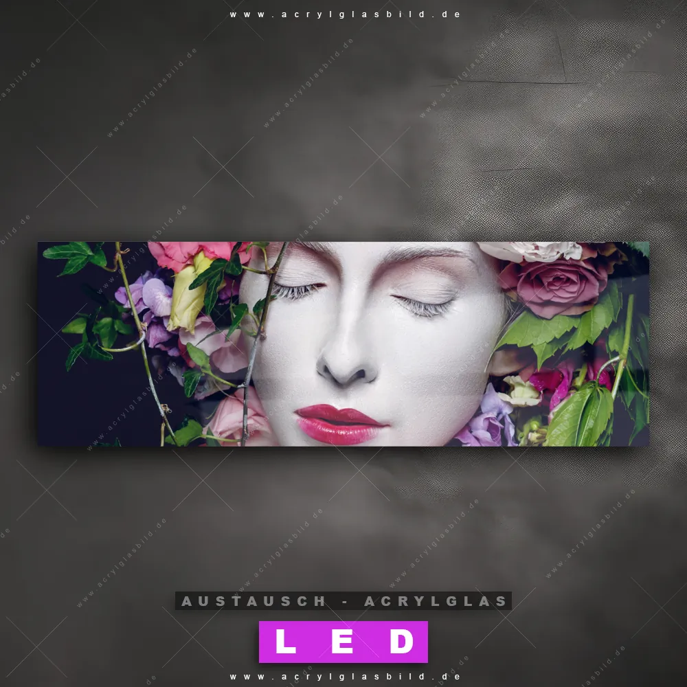 Begriffe wie Menschen & Blumen, Frau, Porträt, modern, Beauty, Gesicht, Blumen, Blüten, Schönheit, Mode haben dich auf der Suche nach deinem neuen Austausch-Acrylglasbild inspiriert? Dann sollte das Wechsel-Acrylglasbild Frau mit Blumenhaar für dein bereits vorhandenes LED Acrylglasbild Canvalight® DIA den Weg zu dir finden.