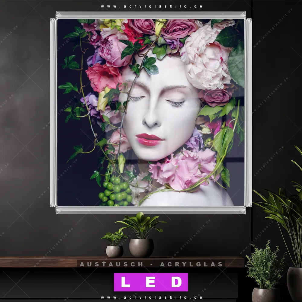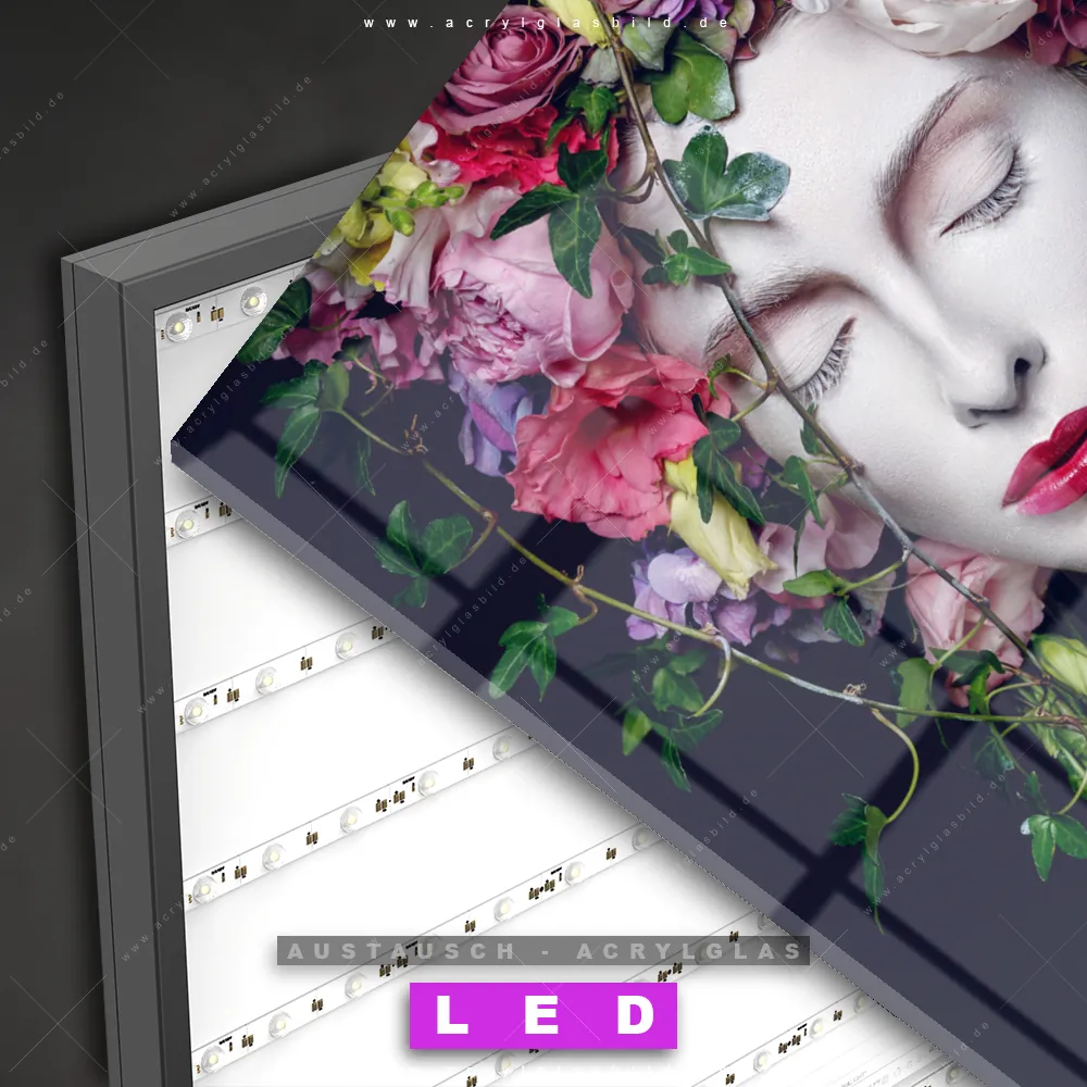 Begriffe wie Menschen & Blumen, Frau, Porträt, modern, Beauty, Gesicht, Blumen, Blüten, Schönheit, Mode haben dich auf der Suche nach deinem neuen Austausch-Acrylglasbild inspiriert? Dann sollte das Wechsel-Acrylglasbild Frau mit Blumenhaar für dein bereits vorhandenes LED Acrylglasbild Canvalight® DIA den Weg zu dir finden.