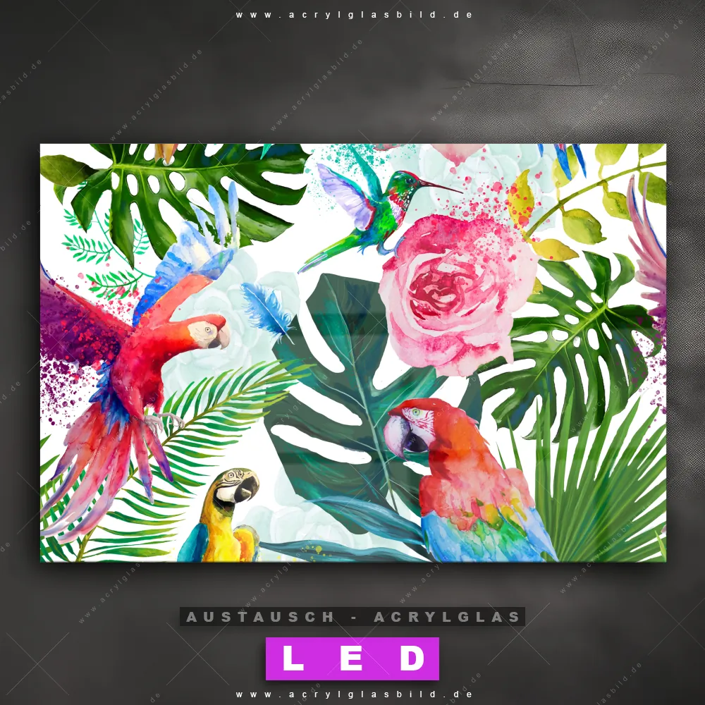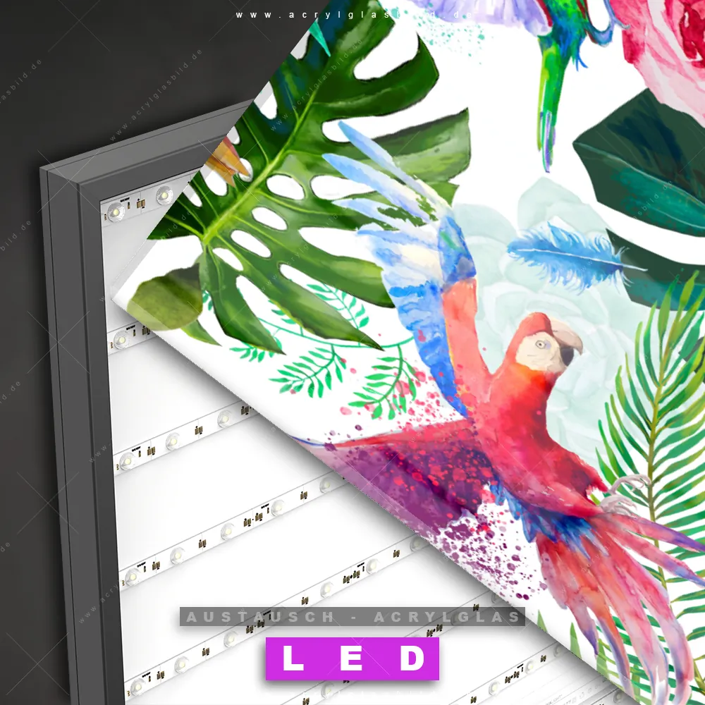 Begriffe wie Tiere & Blumen, Tiere, Vögel, Papagei, Farbe, Aquarell, Blüten, Blumen, Blätter, Flora haben dich auf der Suche nach deinem neuen Austausch-Acrylglasbild inspiriert? Dann sollte das Wechsel-Acrylglasbild exotische Pflanzen und Vögel für dein bereits vorhandenes LED Acrylglasbild Canvalight® DIA den Weg zu dir finden.