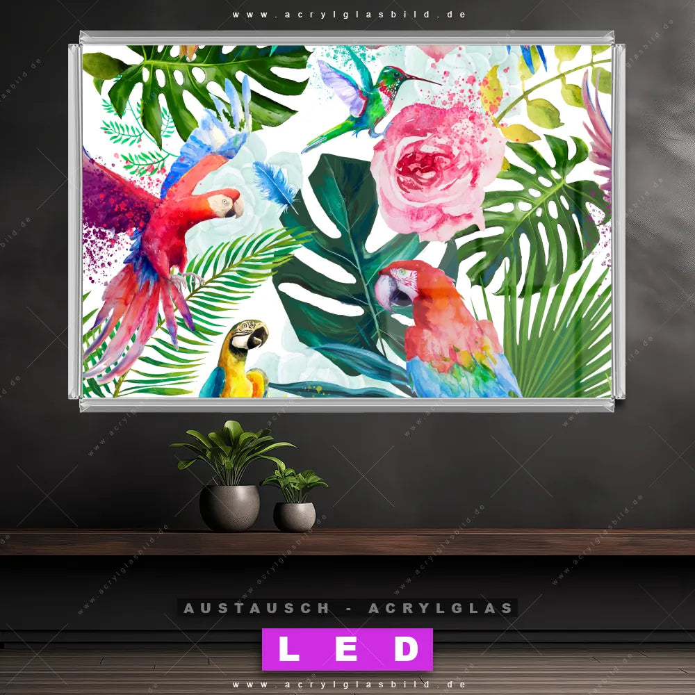 Wechsel-Acrylglas Canvalight® DIA | Blumen & Papageien Aquarell | Querformat