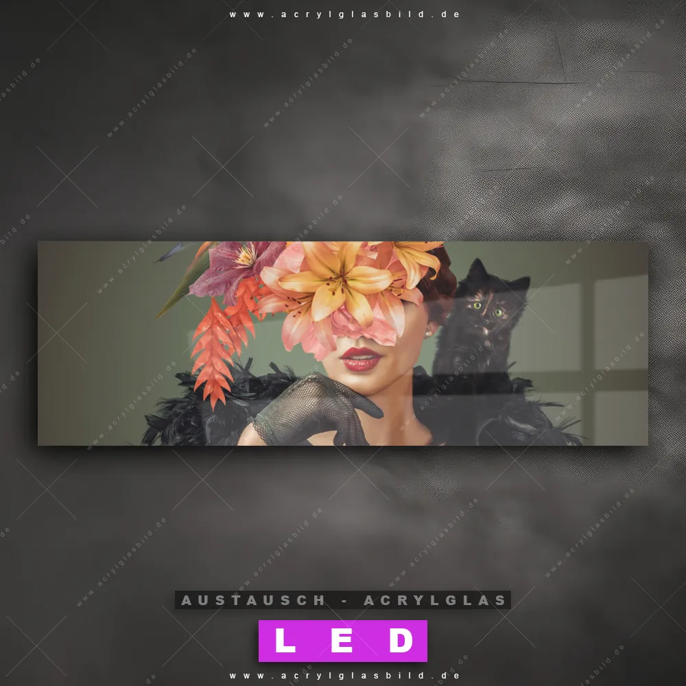 Begriffe wie Menschen & Blumen, Frau, Porträt, modern, Beauty, Gesicht, Blumen, Blüten, Schönheit, Mode, Halloween, Katze, Echse, Kürbis haben dich auf der Suche nach deinem neuen Austausch-Acrylglasbild inspiriert? Dann sollte das Wechsel-Acrylglasbild Frau mit Blumen und Tieren für dein bereits vorhandenes LED Acrylglasbild Canvalight® DIA den Weg zu dir finden.