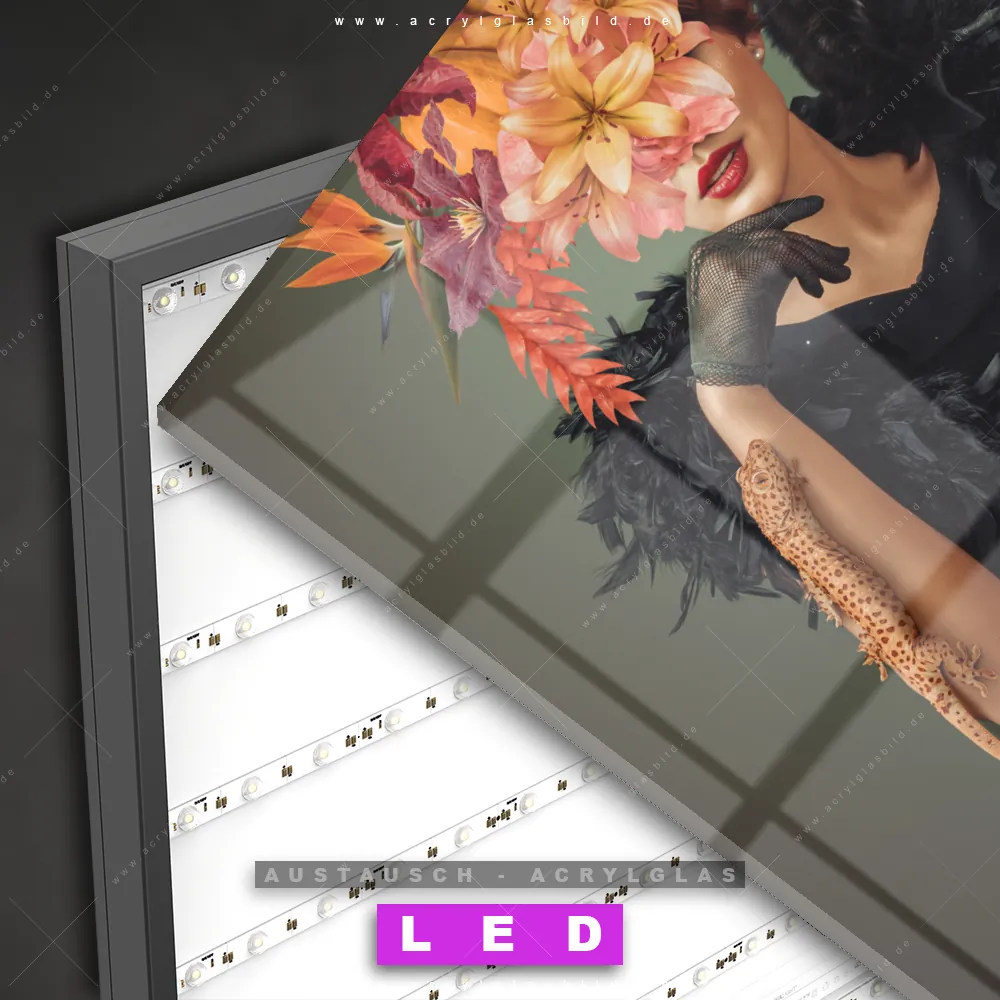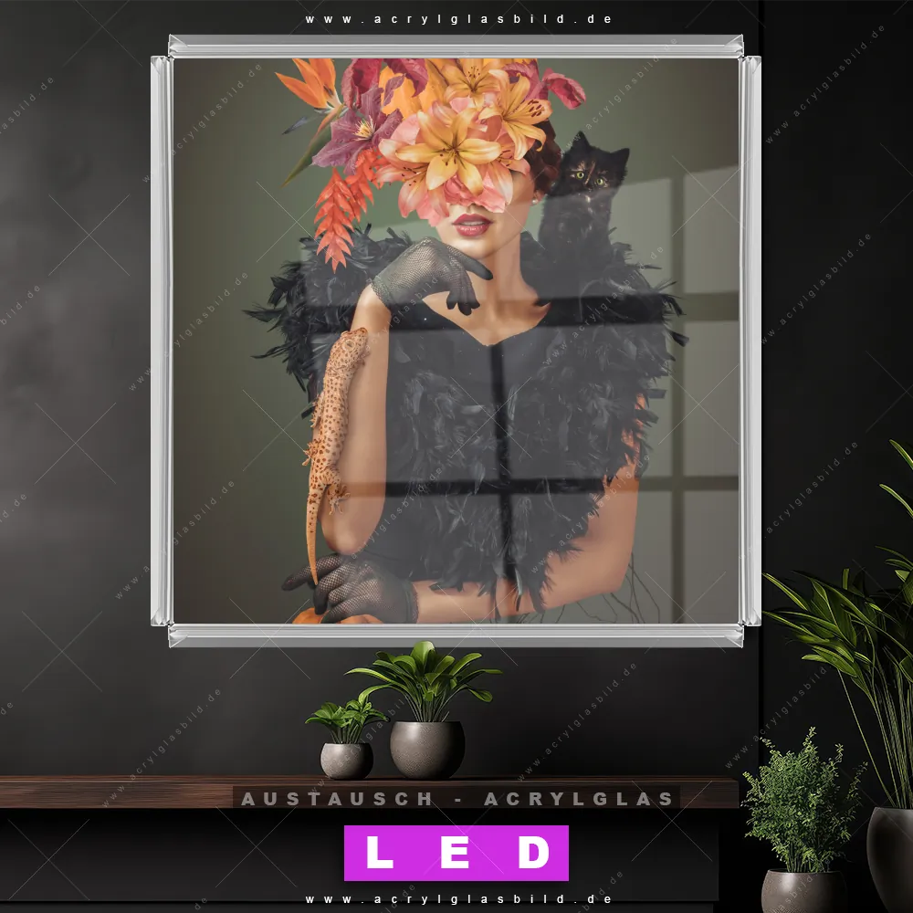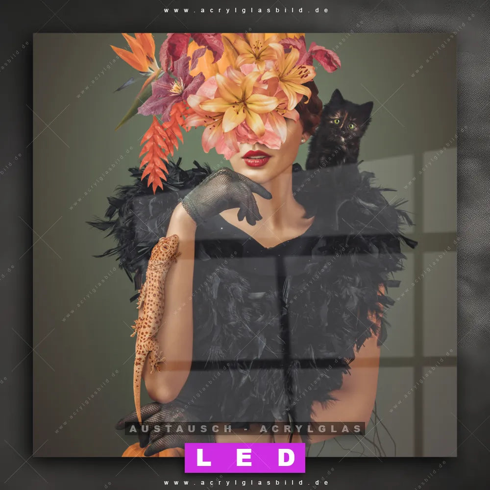 Begriffe wie Menschen & Blumen, Frau, Porträt, modern, Beauty, Gesicht, Blumen, Blüten, Schönheit, Mode, Halloween, Katze, Echse, Kürbis haben dich auf der Suche nach deinem neuen Austausch-Acrylglasbild inspiriert? Dann sollte das Wechsel-Acrylglasbild Frau mit Blumen und Tieren für dein bereits vorhandenes LED Acrylglasbild Canvalight® DIA den Weg zu dir finden.