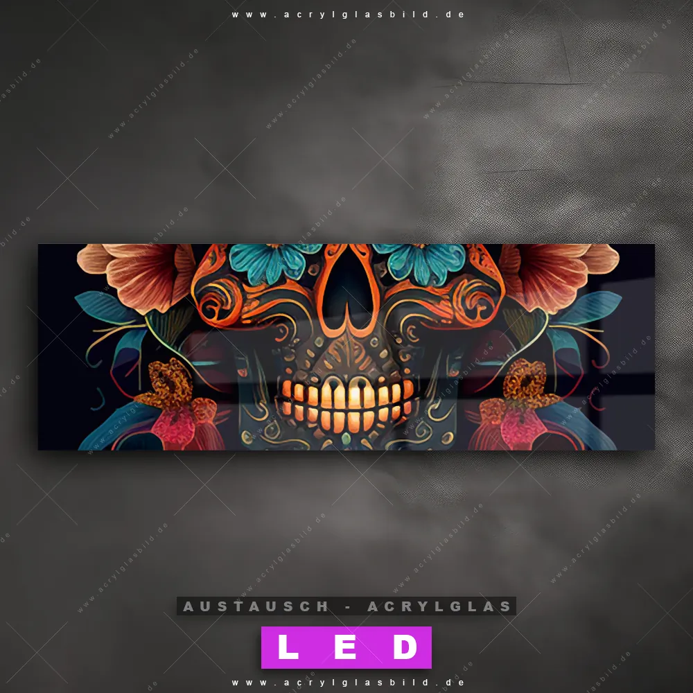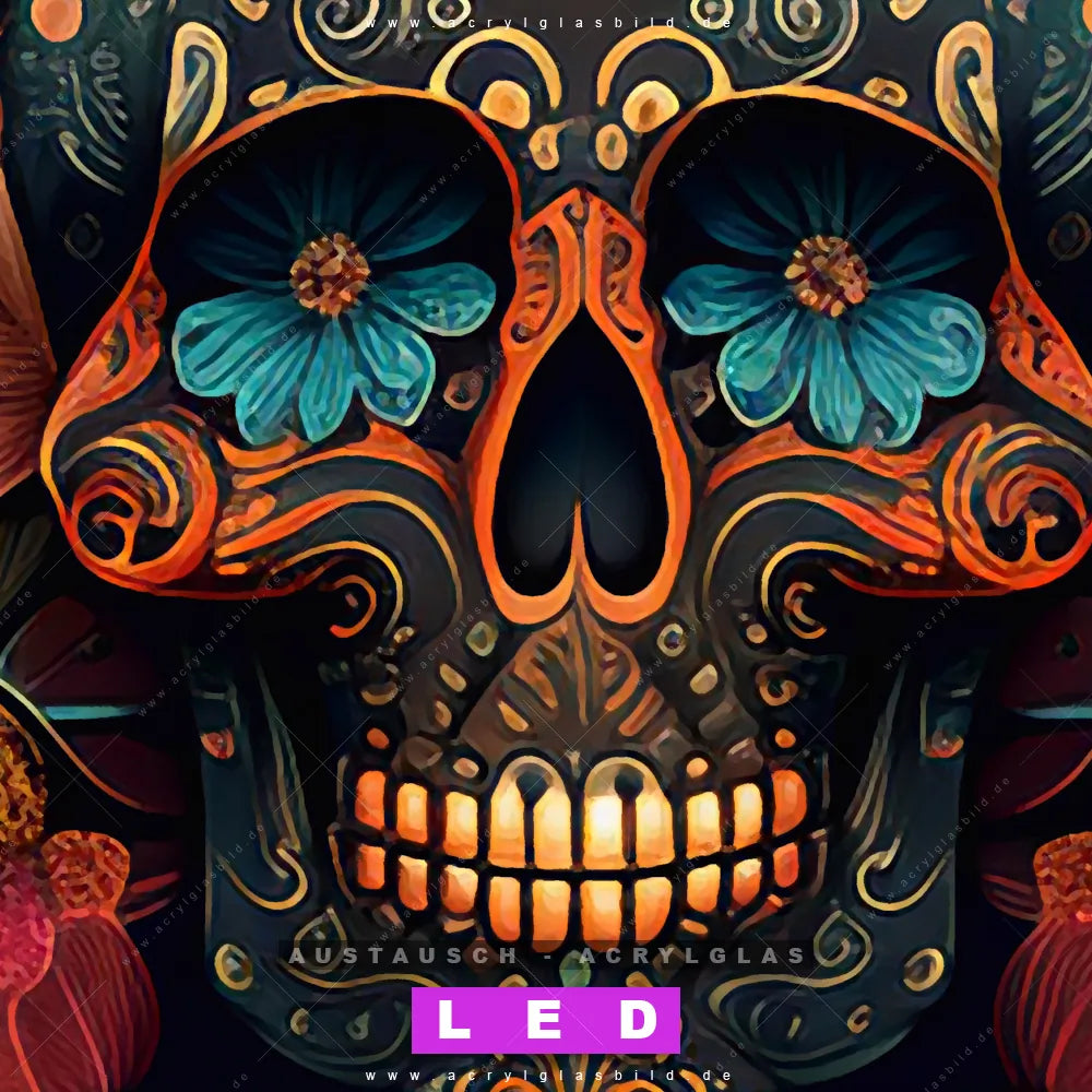 Begriffe wie Schädel, Totenkopf, Skelett, Skull, Knochen, Blumen, Blüten, Blätter haben dich auf der Suche nach deinem neuen Austausch-Acrylglasbild inspiriert? Dann sollte das Wechsel-Acrylglasbild verzierter Totenkopf für dein bereits vorhandenes LED Acrylglasbild Canvalight® DIA den Weg zu dir finden.