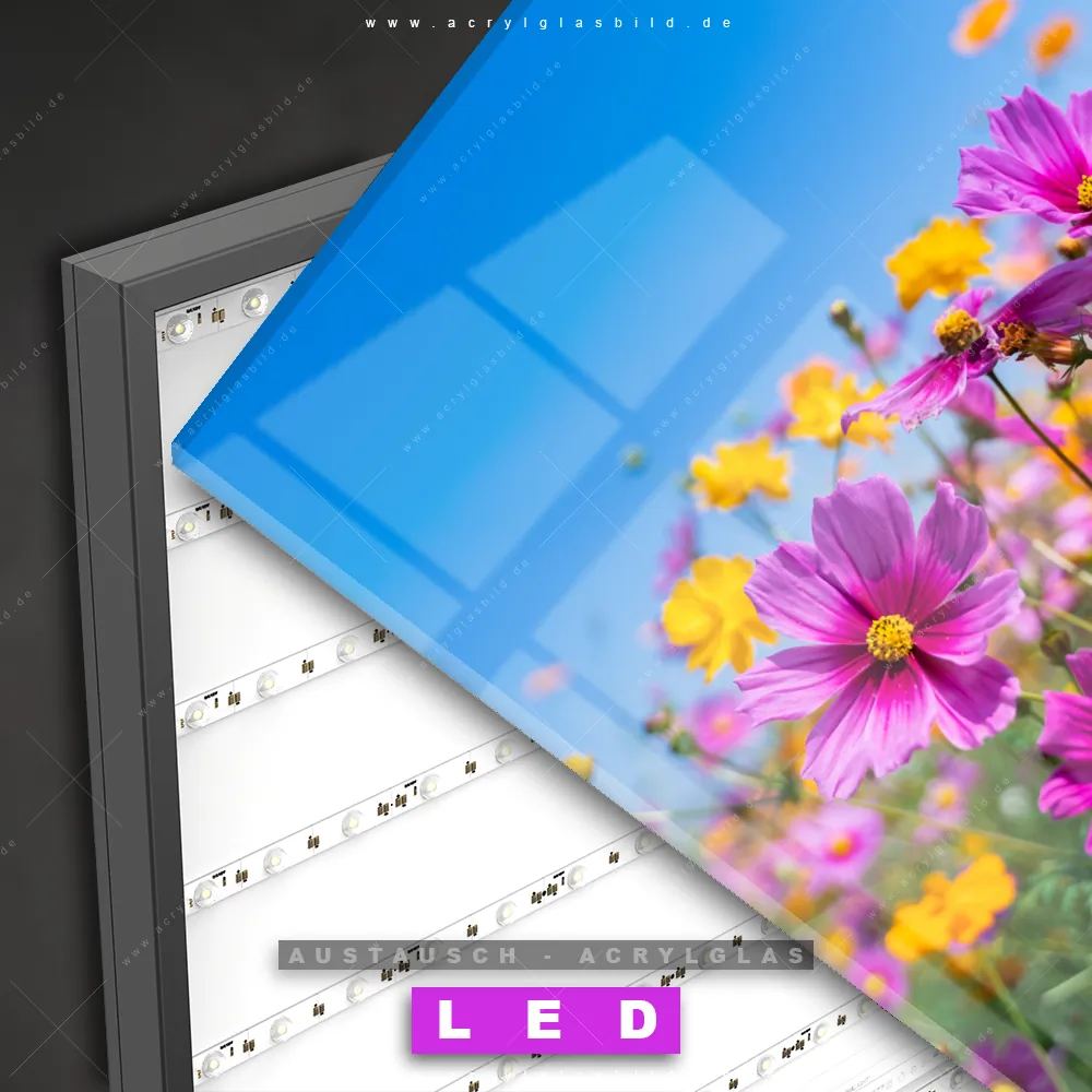 Begriffe wie Natur, Wiese, Feld, Blumen, Blüten haben dich auf der Suche nach deinem neuen Austausch-Acrylglasbild inspiriert? Dann sollte das Wechsel-Acrylglasbild Gelbe und rosafarbene Feldblumen für dein bereits vorhandenes LED Acrylglasbild Canvalight® DIA den Weg zu dir finden.