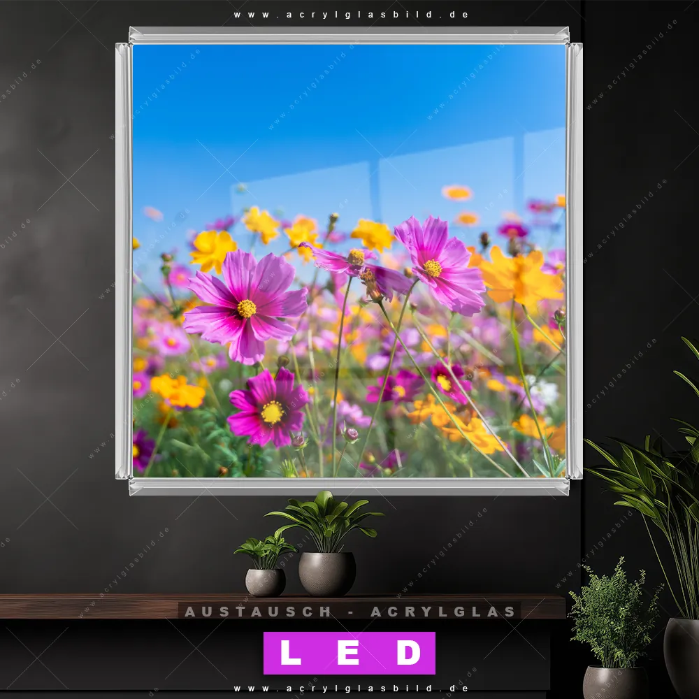 Wechsel-Acrylglas Canvalight® DIA | Blumenwiese unter blauem Himmel | Quadrat