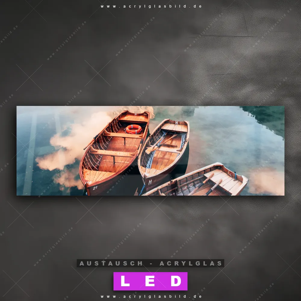 Begriffe wie Urlaub, Reisen, Pier, Steg, Wasser, Berge, Bergsee, See, Wasserspiegelung, Boot, Boote, Holzboot, Gebirge, Nebel, Natur haben dich auf der Suche nach deinem neuen Austausch-Acrylglasbild inspiriert? Dann sollte das Wechsel-Acrylglasbild Boote auf klarem See für dein bereits vorhandenes LED Acrylglasbild Canvalight® DIA den Weg zu dir finden.