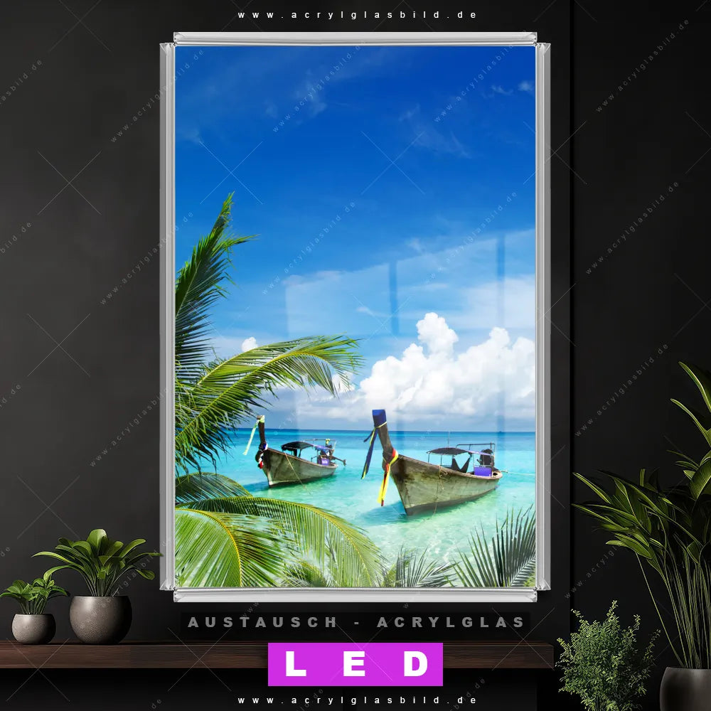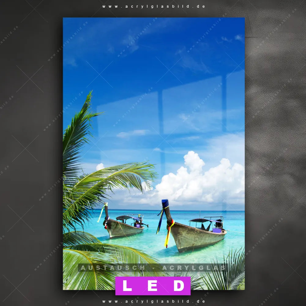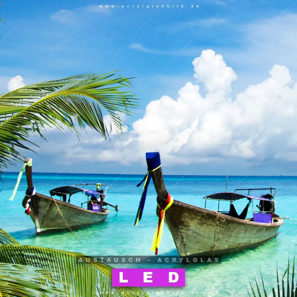 Begriffe wie Ozean, Wasser, Horizont, Thailand, Bucht, Paradies, Boote, Schiffe, Insel, Südsee - Karibik, Urlaub - Reisen haben dich auf der Suche nach deinem neuen Austausch-Acrylglasbild inspiriert? Dann sollte das Wechsel-Acrylglasbild Boote im karibischen Meer für dein bereits vorhandenes LED Acrylglasbild Canvalight® DIA den Weg zu dir finden.