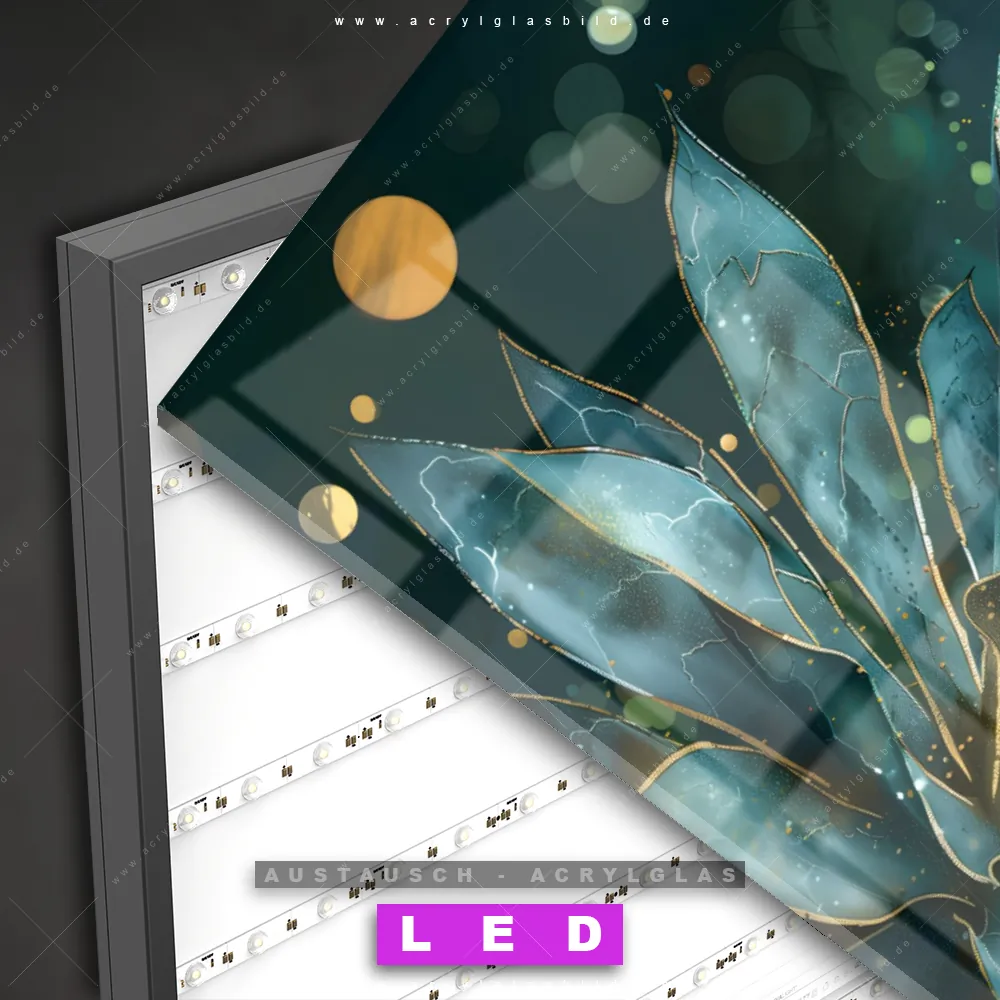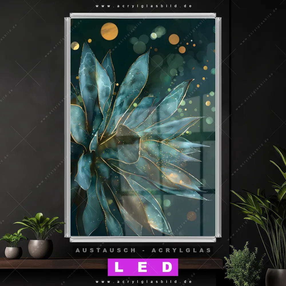 Begriffe wie Blumen, Sukkulente, Kaktus, Pflanze, Natur, Blüten, Glitzer haben dich auf der Suche nach deinem neuen Austausch-Acrylglasbild inspiriert? Dann sollte das Wechsel-Acrylglasbild Magische Blätter für dein bereits vorhandenes LED Acrylglasbild Canvalight® DIA den Weg zu dir finden.