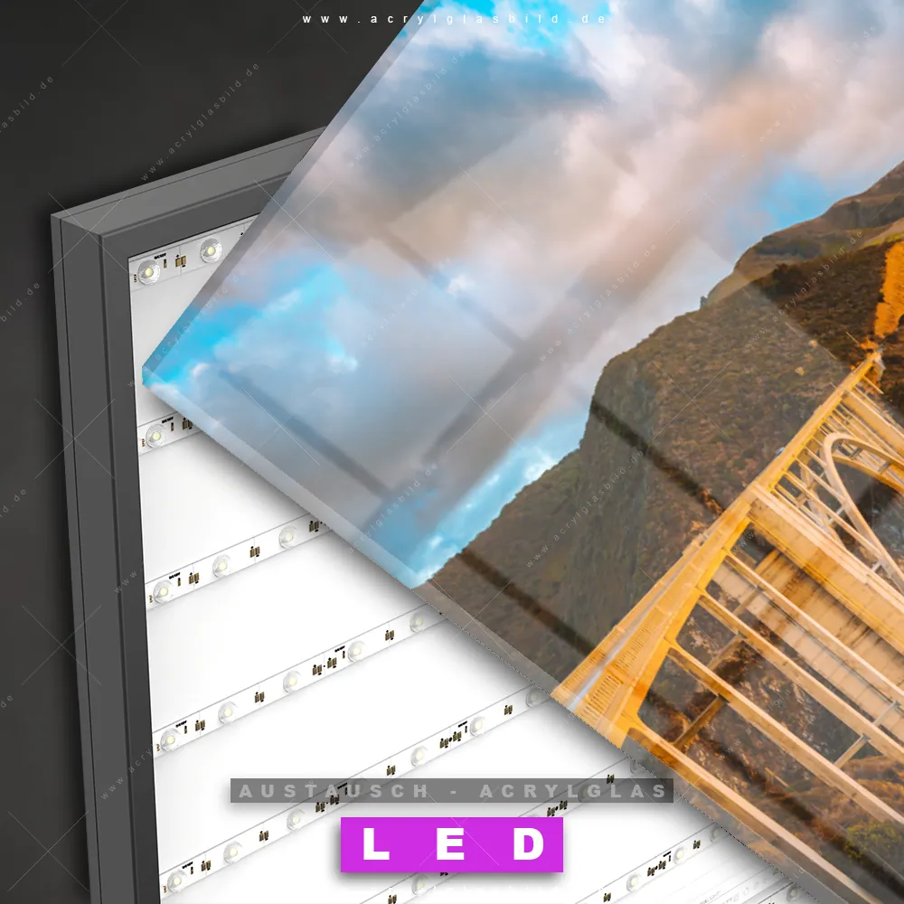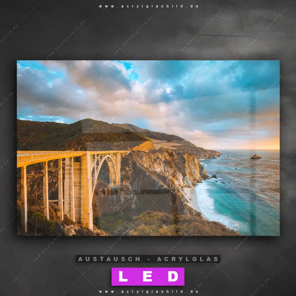 Begriffe wie Urlaub, Reisen, Berge, Brücke, Küste, Wellen, Meer, Abendstimmung, Sonnenuntergang haben dich auf der Suche nach deinem neuen Austausch-Acrylglasbild inspiriert? Dann sollte das Wechsel-Acrylglasbild Brücke am Meer für dein bereits vorhandenes LED Acrylglasbild Canvalight® DIA den Weg zu dir finden.