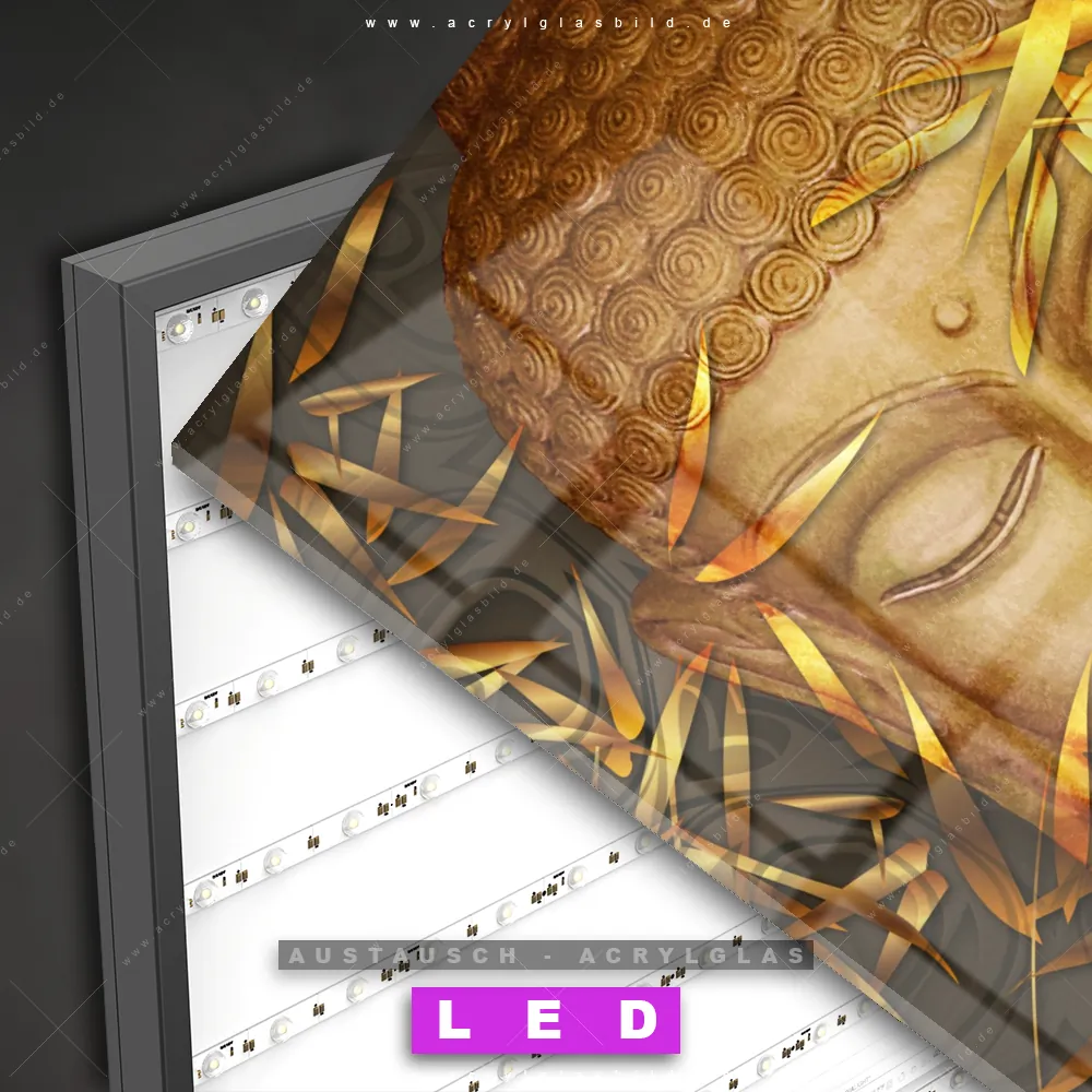 Begriffe wie Buddha, Buddhismus, Religion, Feng Shui, Zen, Meditation, Gold haben dich auf der Suche nach deinem neuen Austausch-Acrylglasbild inspiriert? Dann sollte das Wechsel-Acrylglasbild Buddha Kopf für dein bereits vorhandenes LED Acrylglasbild Canvalight® DIA den Weg zu dir finden.