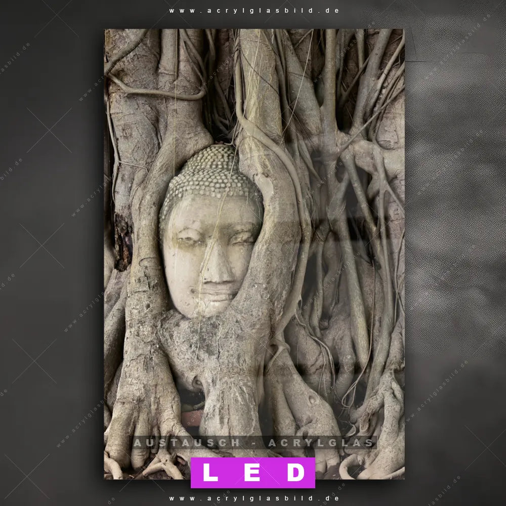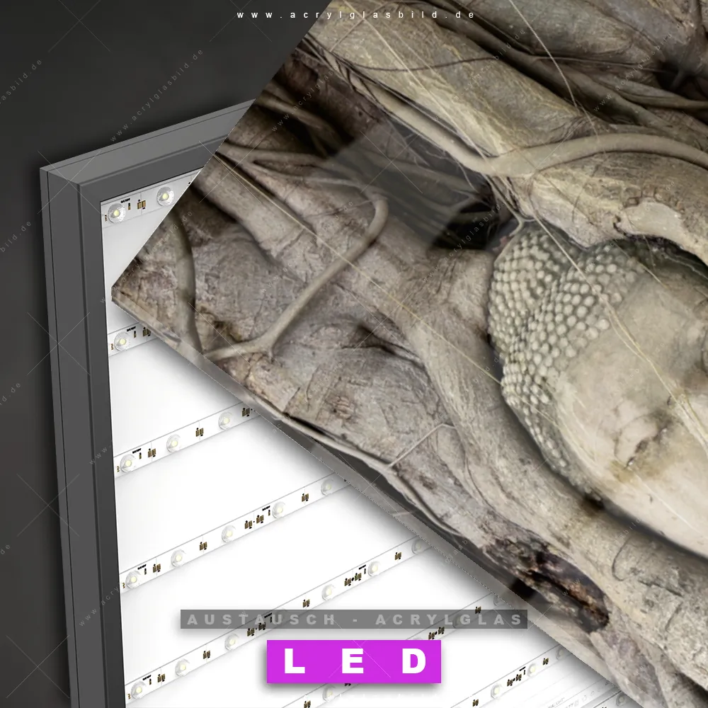 Begriffe wie Buddha, Buddhismus, Religion, Feng Shui, Zen, Meditation, spirituell, heilig, Esoterik, Gott, Gesicht, Statue, Wurzeln, Baum haben dich auf der Suche nach deinem neuen Austausch-Acrylglasbild inspiriert? Dann sollte das Wechsel-Acrylglasbild Buddha-Gesicht im Baum für dein bereits vorhandenes LED Acrylglasbild Canvalight® DIA den Weg zu dir finden.
