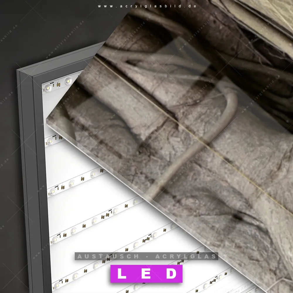 Begriffe wie Buddha, Buddhismus, Religion, Feng Shui, Zen, Meditation, spirituell, heilig, Esoterik, Gott, Gesicht, Statue, Wurzeln, Baum haben dich auf der Suche nach deinem neuen Austausch-Acrylglasbild inspiriert? Dann sollte das Wechsel-Acrylglasbild Buddha-Gesicht im Baum für dein bereits vorhandenes LED Acrylglasbild Canvalight® DIA den Weg zu dir finden.