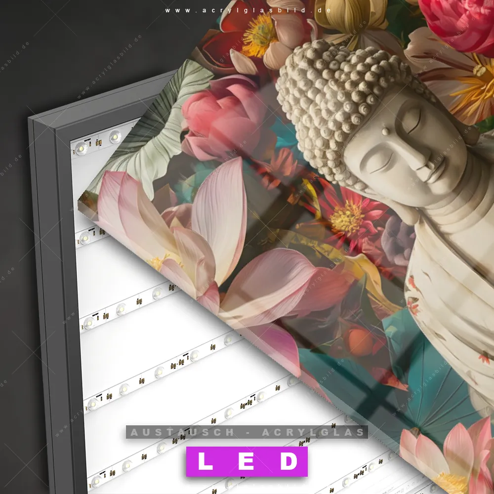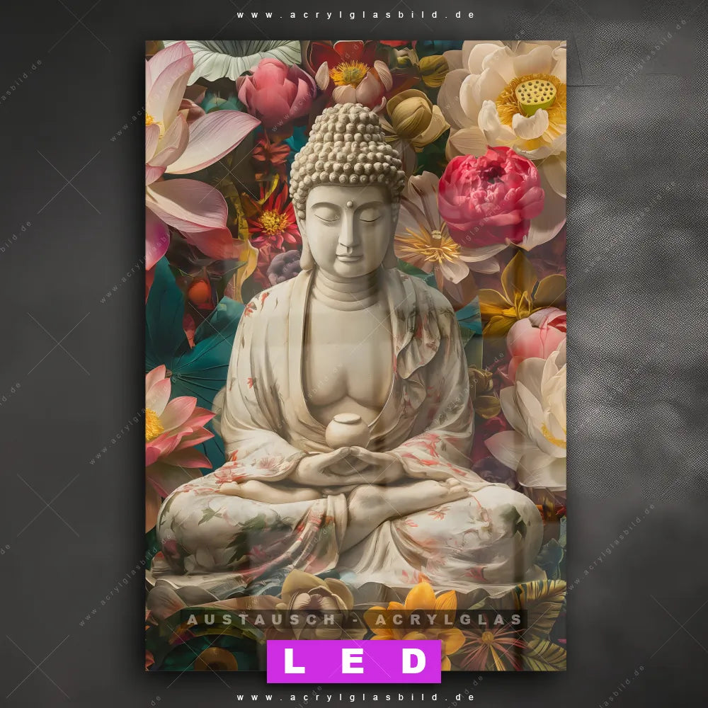 Wechsel-Acrylglas Canvalight® DIA | Buddha in farbenfrohen Blumen | Hochformat
