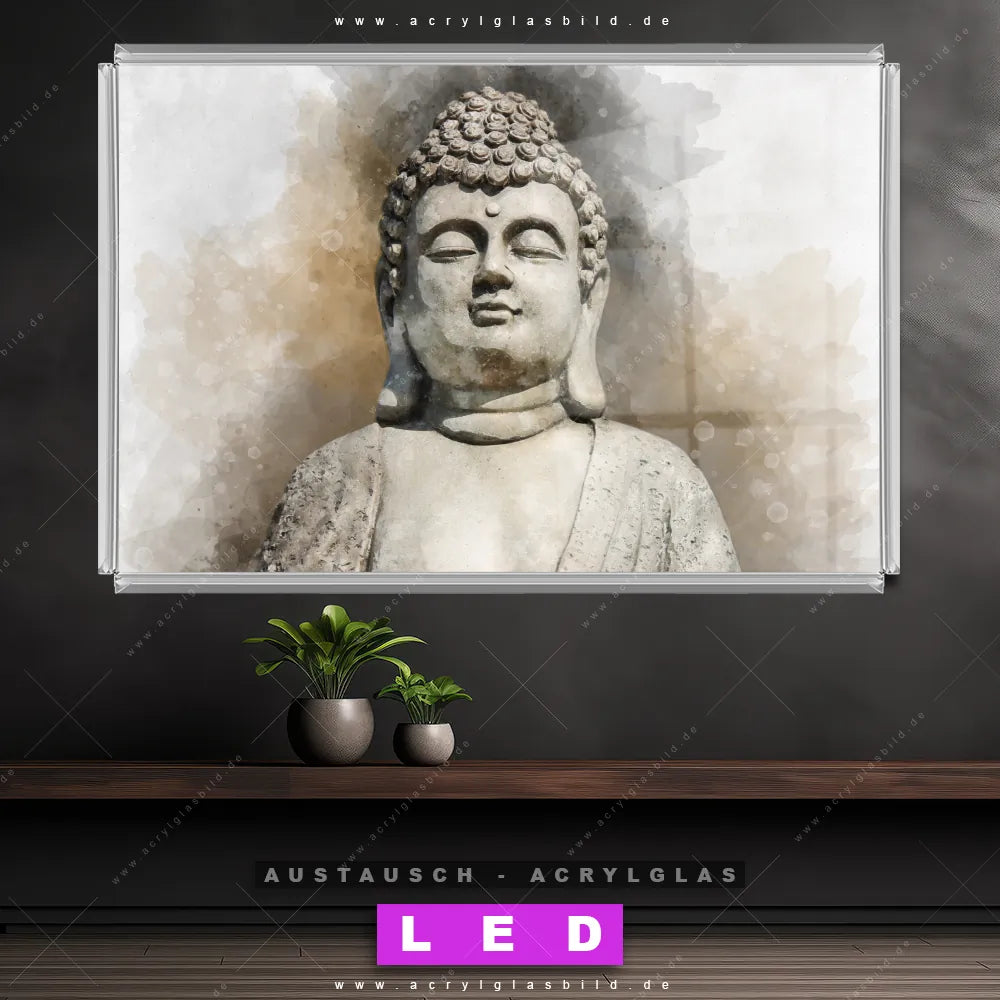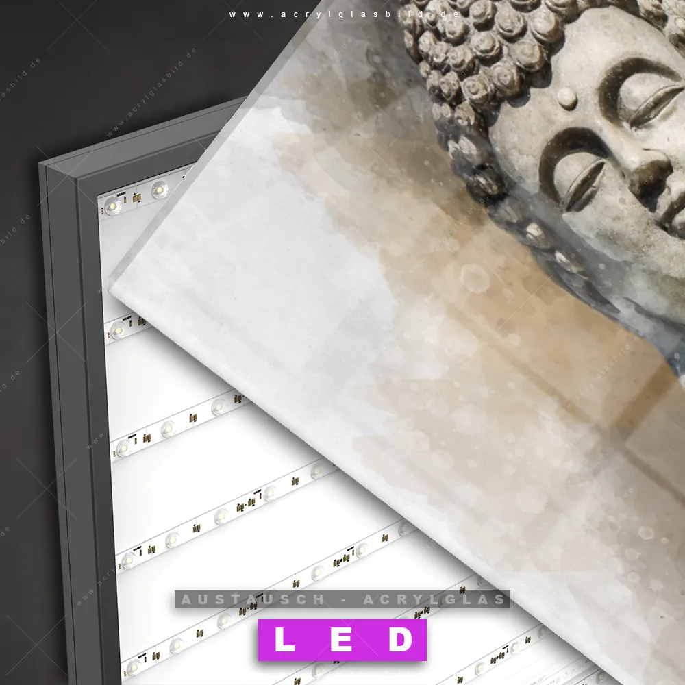 Begriffe wie Buddha, Buddhismus, Religion, Feng Shui, Zen, Meditation, spirituell, heilig, Esoterik, Gott, Gesicht, Statue haben dich auf der Suche nach deinem neuen Austausch-Acrylglasbild inspiriert? Dann sollte das Wechsel-Acrylglasbild Buddha-Statue für dein bereits vorhandenes LED Acrylglasbild Canvalight® DIA den Weg zu dir finden.