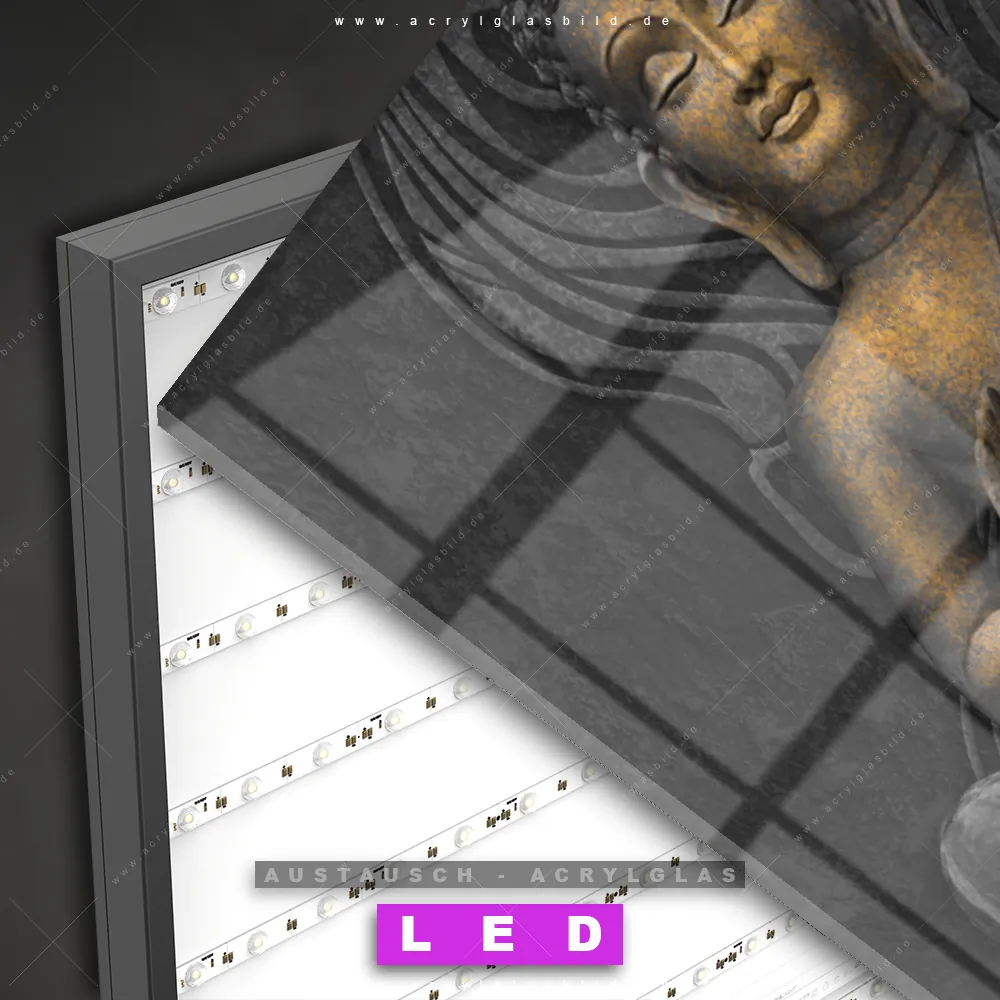 Begriffe wie Buddha, Buddhismus, Religion, Feng Shui, Zen, Meditation, Lotus Pose, spirituell, Gott haben dich auf der Suche nach deinem neuen Austausch-Acrylglasbild inspiriert? Dann sollte das Wechsel-Acrylglasbild Buddha im Lotus-Sitz für dein bereits vorhandenes LED Acrylglasbild Canvalight® DIA den Weg zu dir finden.
