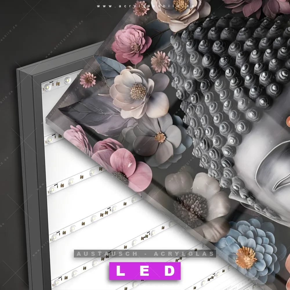 Begriffe wie Buddha, Buddhismus, Religion, Meditation, Blumen, Porträt, Spirituell, Statue haben dich auf der Suche nach deinem neuen Austausch-Acrylglasbild inspiriert? Dann sollte das Wechsel-Acrylglasbild Spiritueller Buddha und Blumen für dein bereits vorhandenes LED Acrylglasbild Canvalight® DIA den Weg zu dir finden.