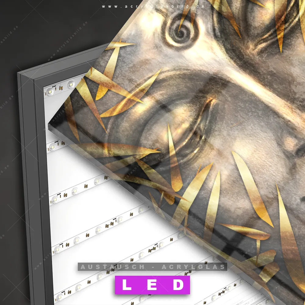 Begriffe wie Buddha, Buddhismus, Religion, Feng Shui, Meditation, Bambus, Yoga haben dich auf der Suche nach deinem neuen Austausch-Acrylglasbild inspiriert? Dann sollte das Wechsel-Acrylglasbild Buddha mit goldenen Blättern für dein bereits vorhandenes LED Acrylglasbild Canvalight® DIA den Weg zu dir finden.