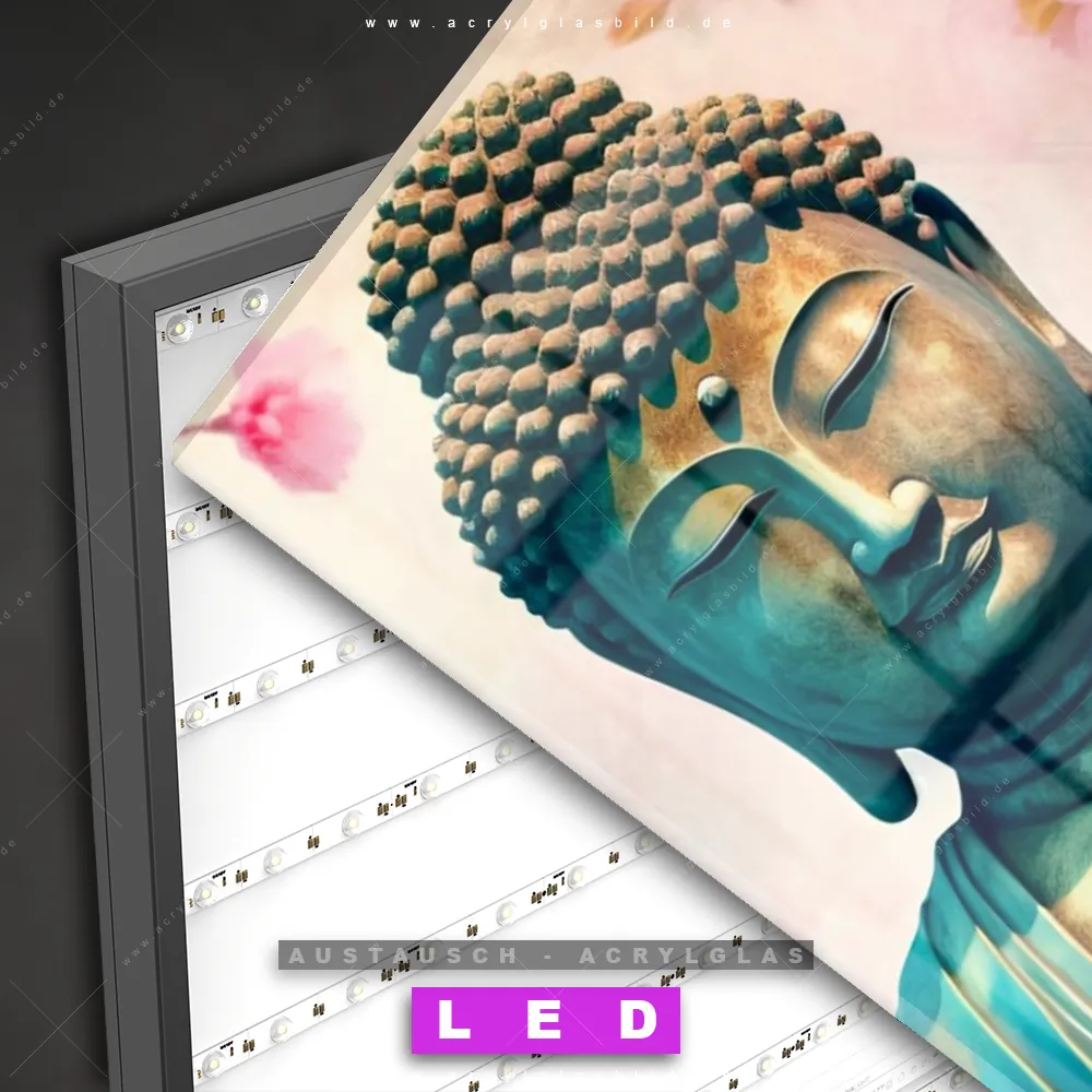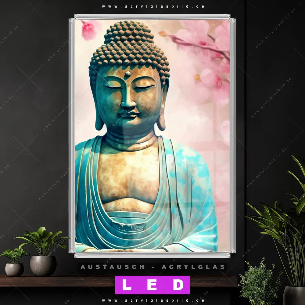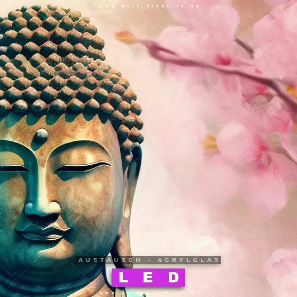 Begriffe wie Buddha, Buddhismus, Meditation, Skulptur, Blüten, Kirschblüten haben dich auf der Suche nach deinem neuen Austausch-Acrylglasbild inspiriert? Dann sollte das Wechsel-Acrylglasbild Buddha inmitten von Blüten für dein bereits vorhandenes LED Acrylglasbild Canvalight® DIA den Weg zu dir finden.
