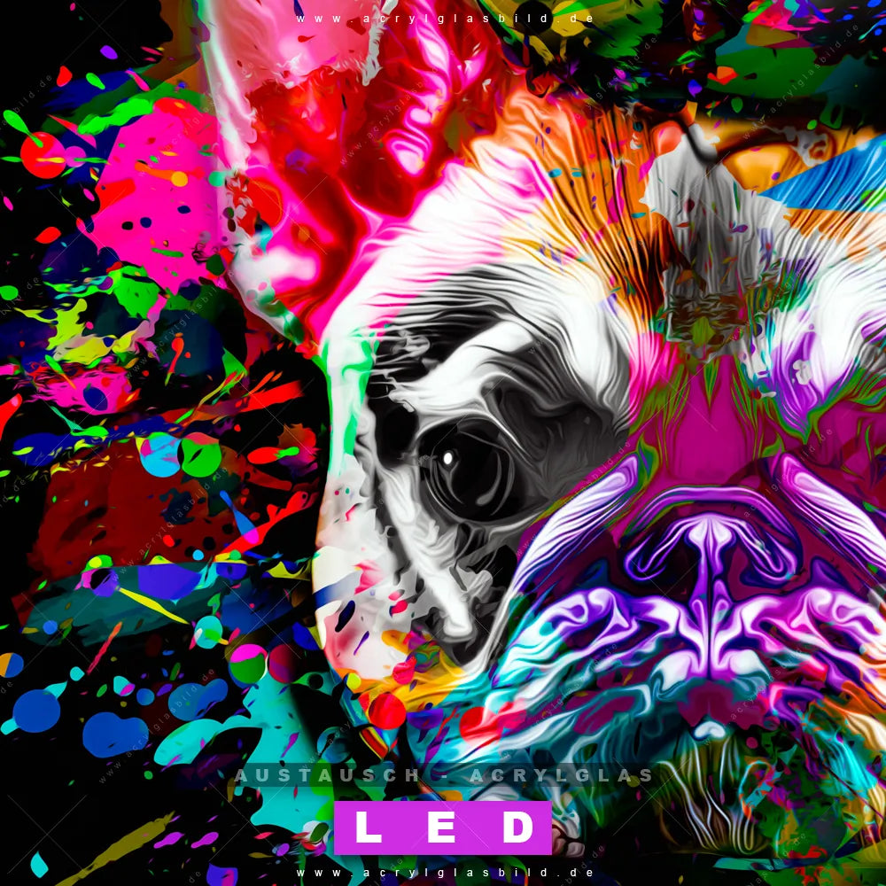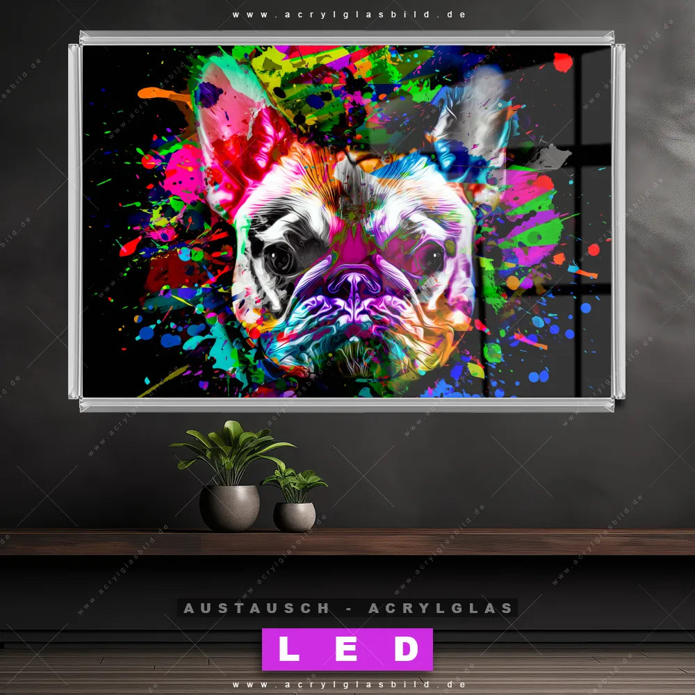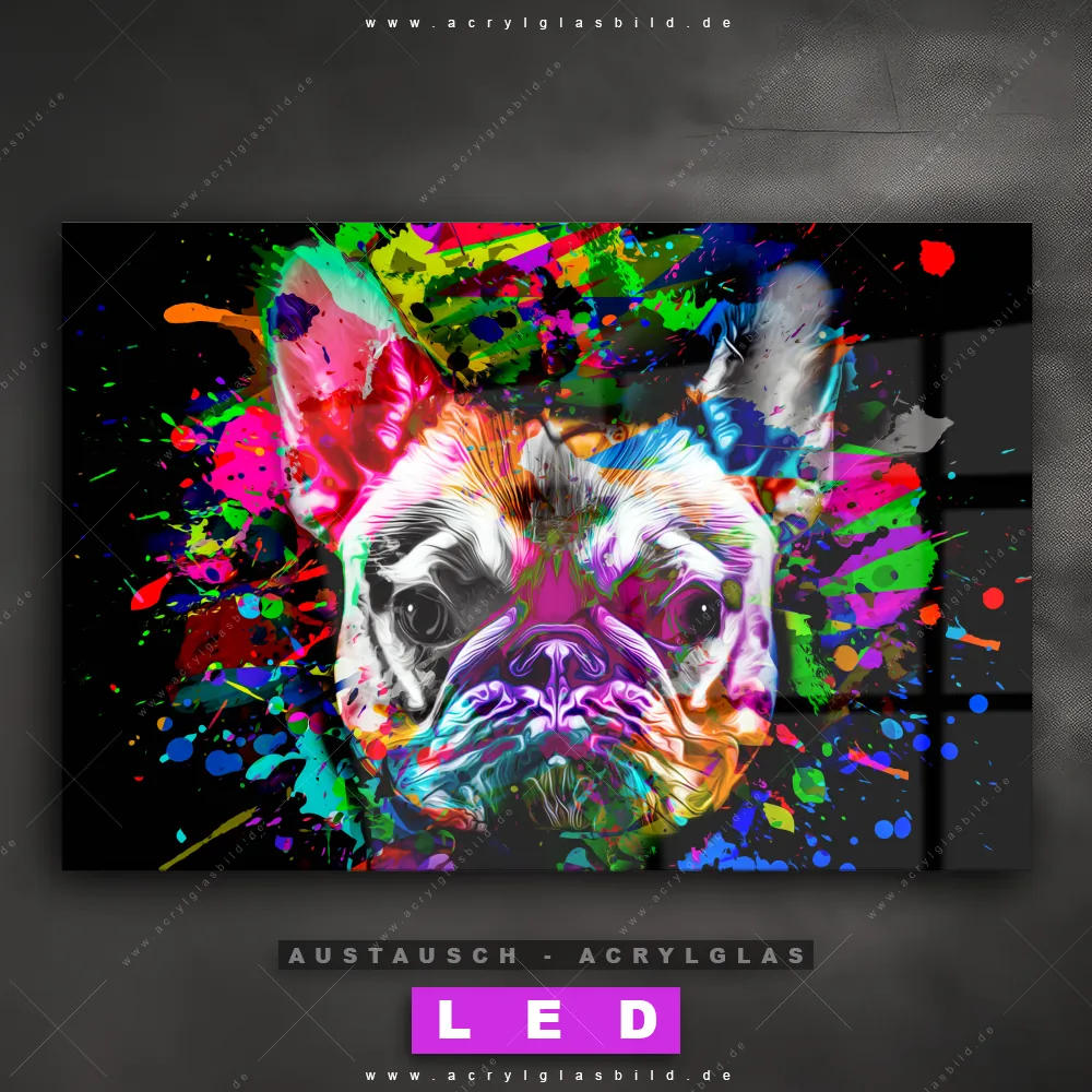 Begriffe wie Bulldogge, Tier, Hund, Splash, Farbspritzer, Französiche Bulldogge, Welpe haben dich auf der Suche nach deinem neuen Austausch-Acrylglasbild inspiriert? Dann sollte das Wechsel-Acrylglasbild Kopf Bulldogge für dein bereits vorhandenes LED Acrylglasbild Canvalight® DIA den Weg zu dir finden.