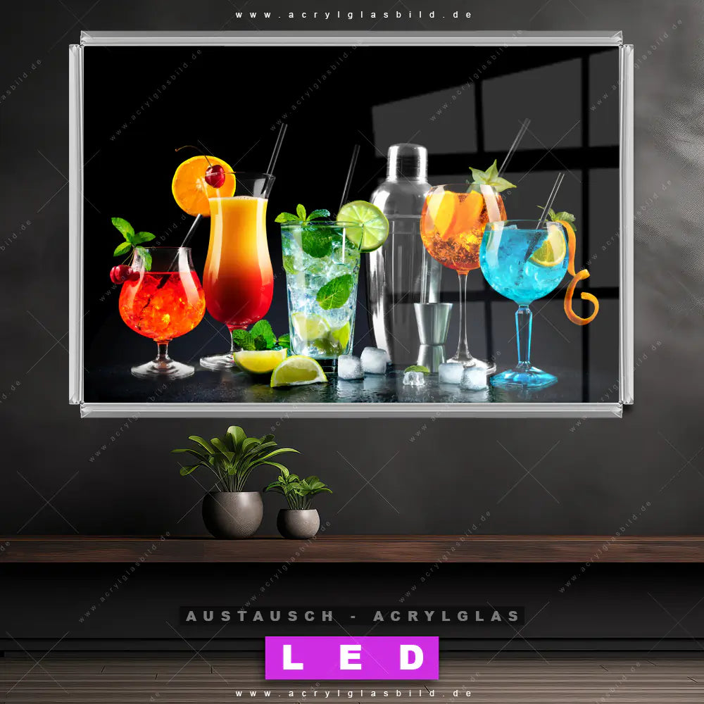 Begriffe wie Glas, Getränke, Alkohol, Cocktail, Eis, Orange, Limette, Shaker haben dich auf der Suche nach deinem neuen Austausch-Acrylglasbild inspiriert? Dann sollte das Wechsel-Acrylglasbild Cocktails - Bunte Erfrischung für dein bereits vorhandenes LED Acrylglasbild Canvalight® DIA den Weg zu dir finden.