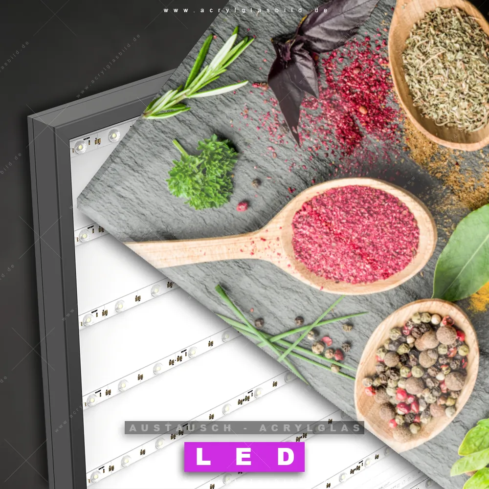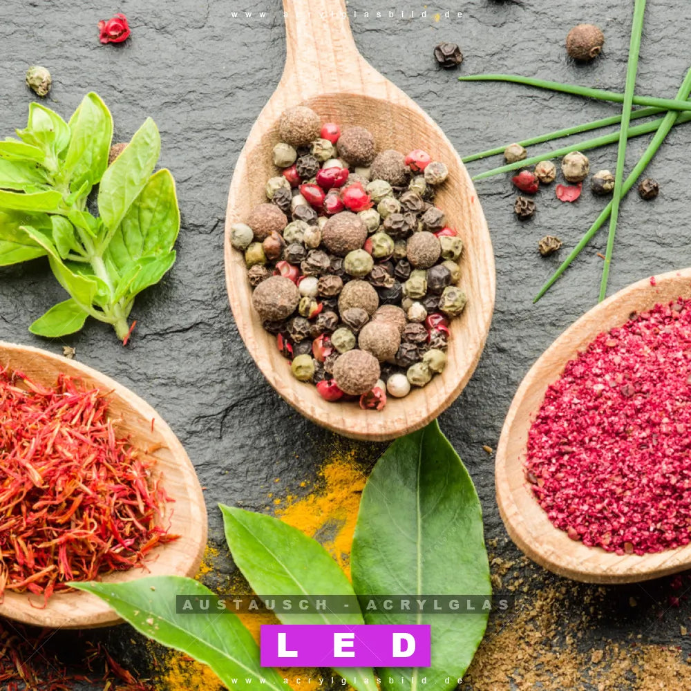Begriffe wie Gewürze, Kräuter, Löffel, kochen, Pfeffer, Curry, Holzlöffel, Küche, Lebensmittel, gesund, Holz haben dich auf der Suche nach deinem neuen Austausch-Acrylglasbild inspiriert? Dann sollte das Wechsel-Acrylglasbild Hölzerne Löffel mit bunten Gewürzen für dein bereits vorhandenes LED Acrylglasbild Canvalight® DIA den Weg zu dir finden.
