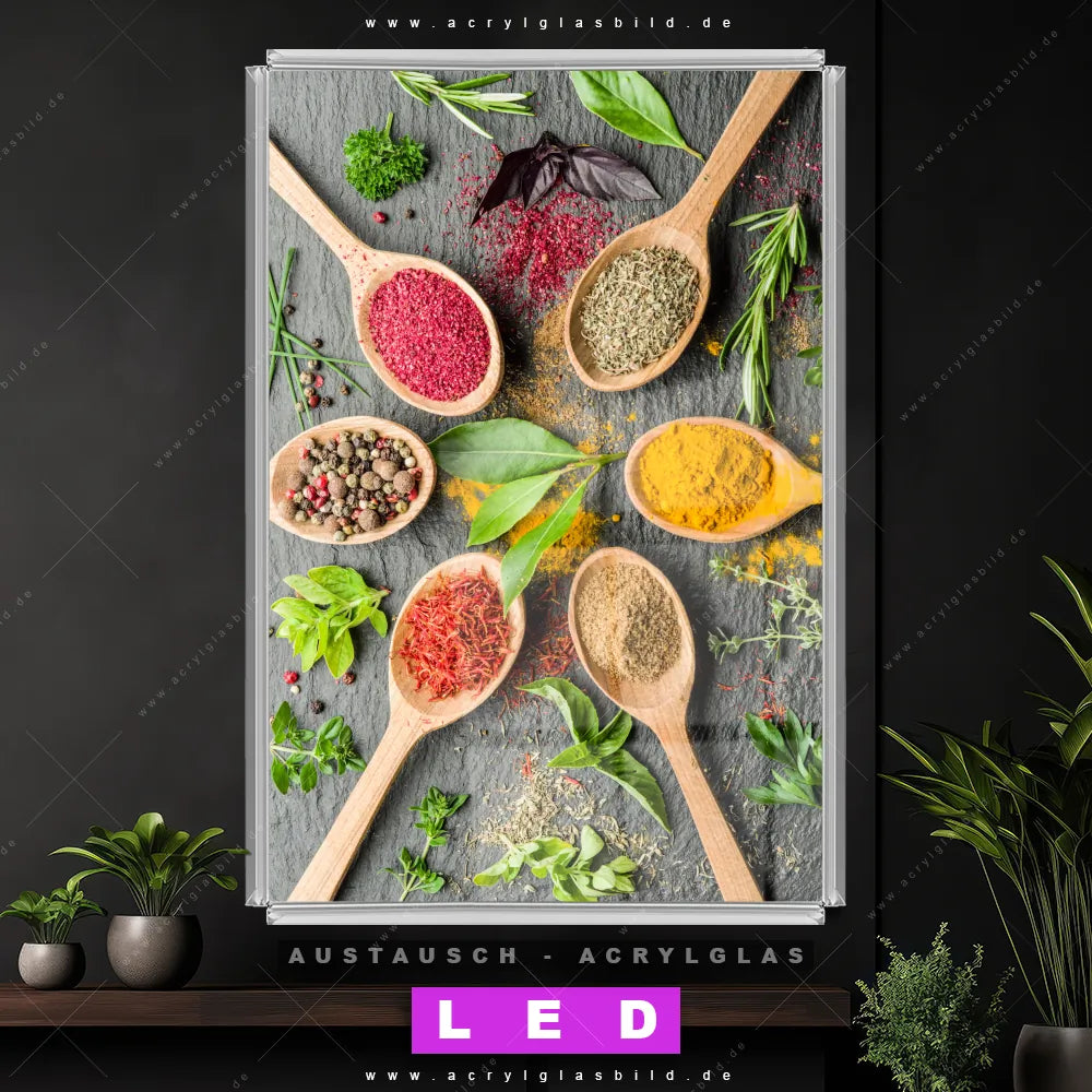 Wechsel-Acrylglas Canvalight® DIA | Bunte Gewürze in Holzlöffeln | Hochformat
