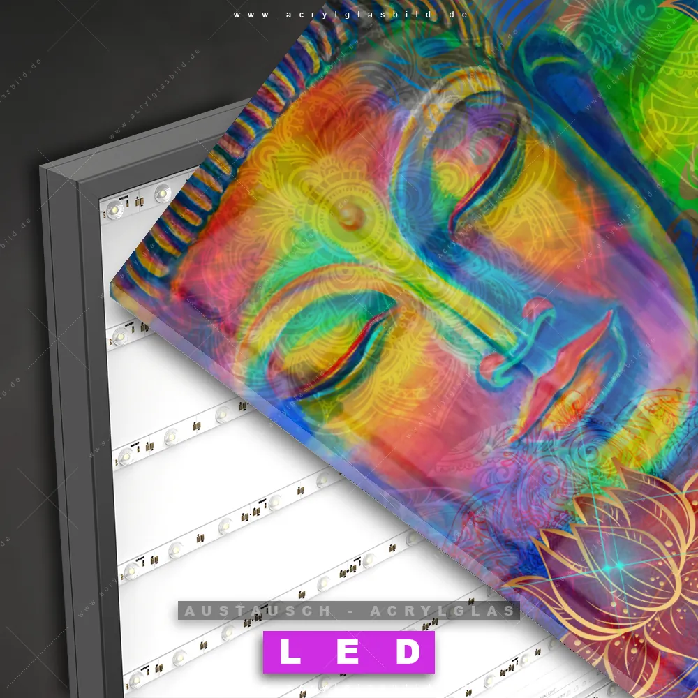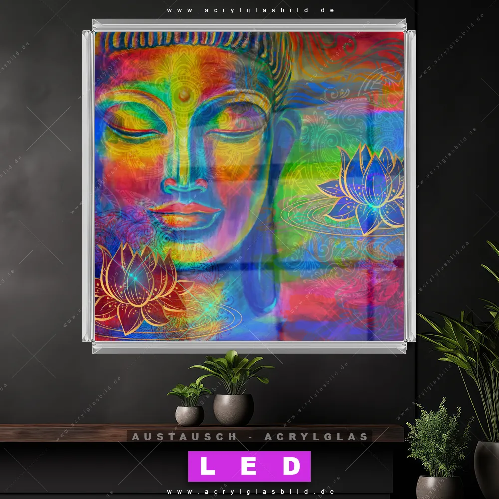 Begriffe wie Buddha, Buddhismus, Religion, Feng Shui, Zen, Meditation, Lotus, Blüte haben dich auf der Suche nach deinem neuen Austausch-Acrylglasbild inspiriert? Dann sollte das Wechsel-Acrylglasbild farbenfroher Buddha für dein bereits vorhandenes LED Acrylglasbild Canvalight® DIA den Weg zu dir finden.