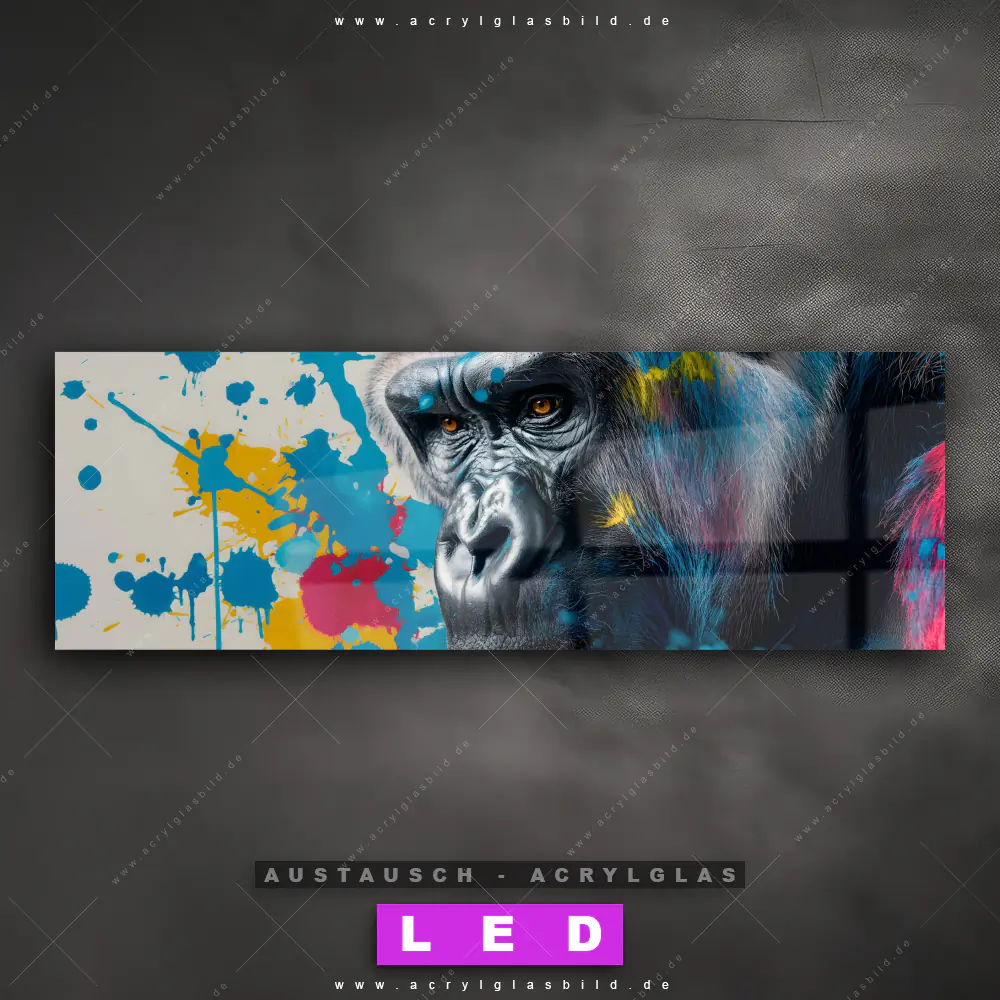 Wechsel-Acrylglas Canvalight® DIA | Bunter Gorilla mit Farbspritzern | Panorama