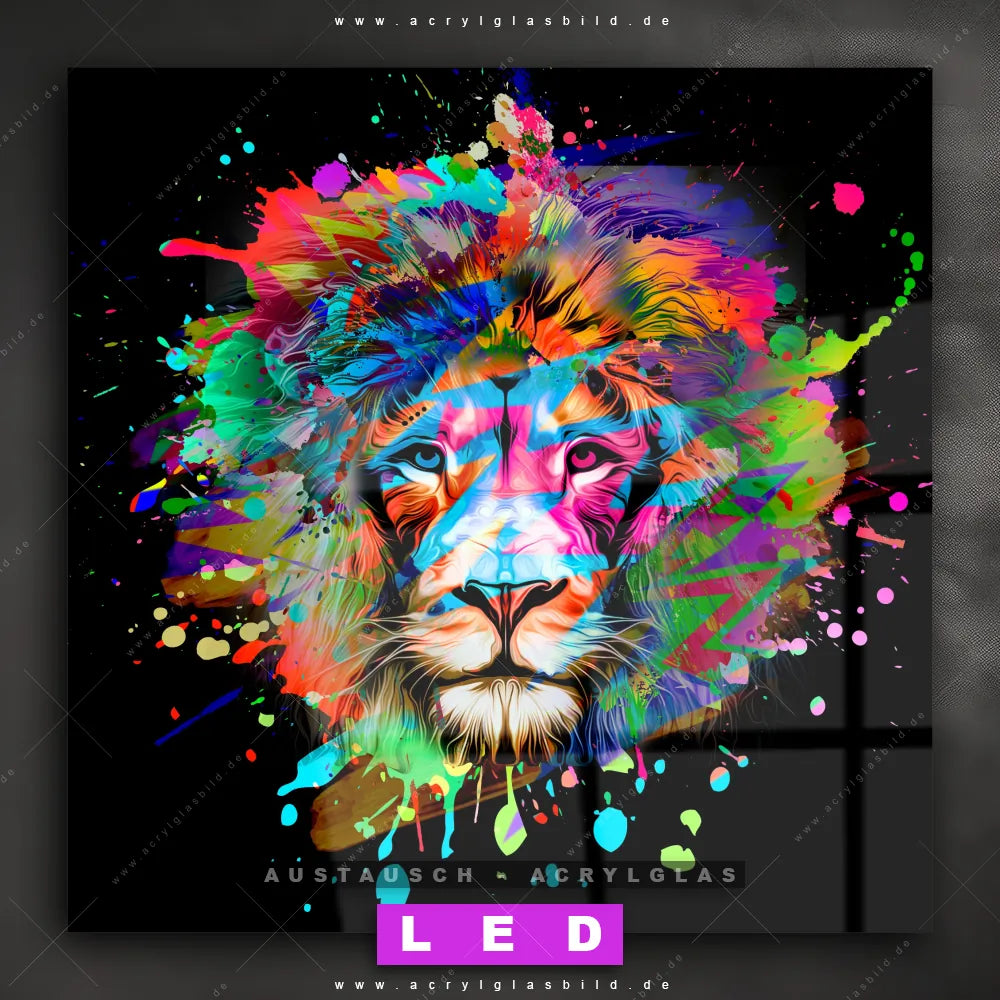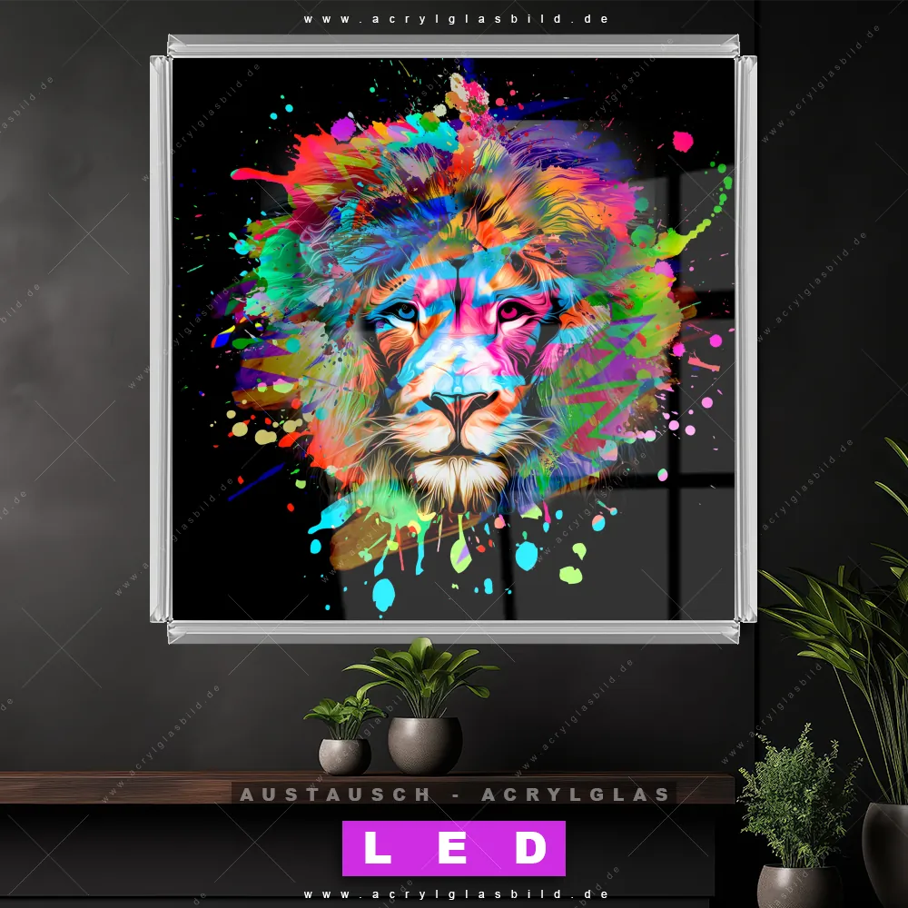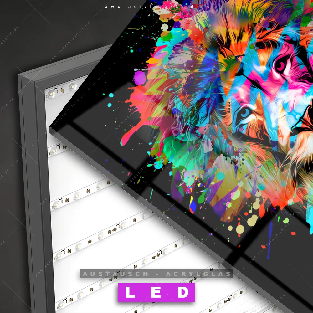 Begriffe wie Raubkatze, Löwe, Afrika, Dschungel, Lion, Splash, Farbspritzer, Farbexplosion, Porträt, Farbe haben dich auf der Suche nach deinem neuen Austausch-Acrylglasbild inspiriert? Dann sollte das Wechsel-Acrylglasbild Löwenkopf abstrakt für dein bereits vorhandenes LED Acrylglasbild Canvalight® DIA den Weg zu dir finden.