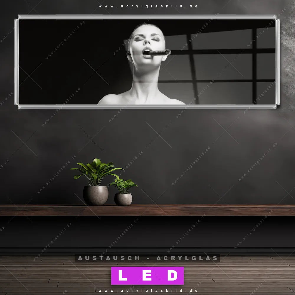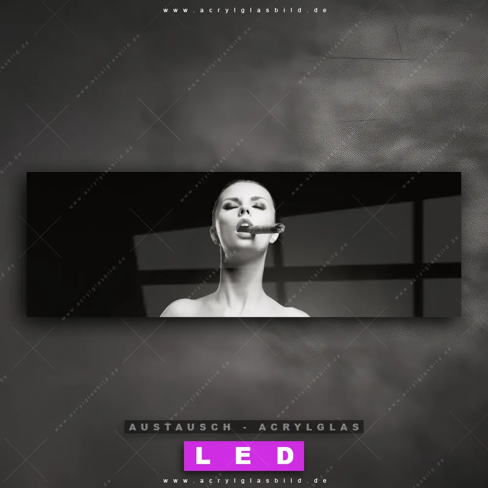 Begriffe wie Frau, Erotik, modern, sexy, rauchen, Zigarre, Körper, Akt haben dich auf der Suche nach deinem neuen Austausch-Acrylglasbild inspiriert? Dann sollte das Wechsel-Acrylglasbild halbnackte Frau mit Zigarre für dein bereits vorhandenes LED Acrylglasbild Canvalight® DIA den Weg zu dir finden.