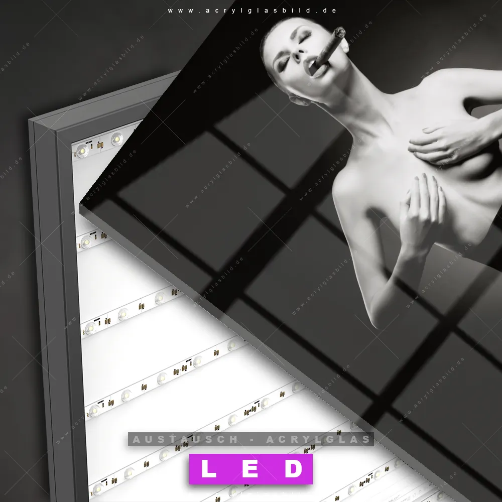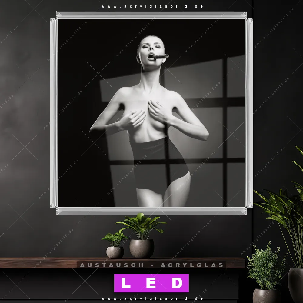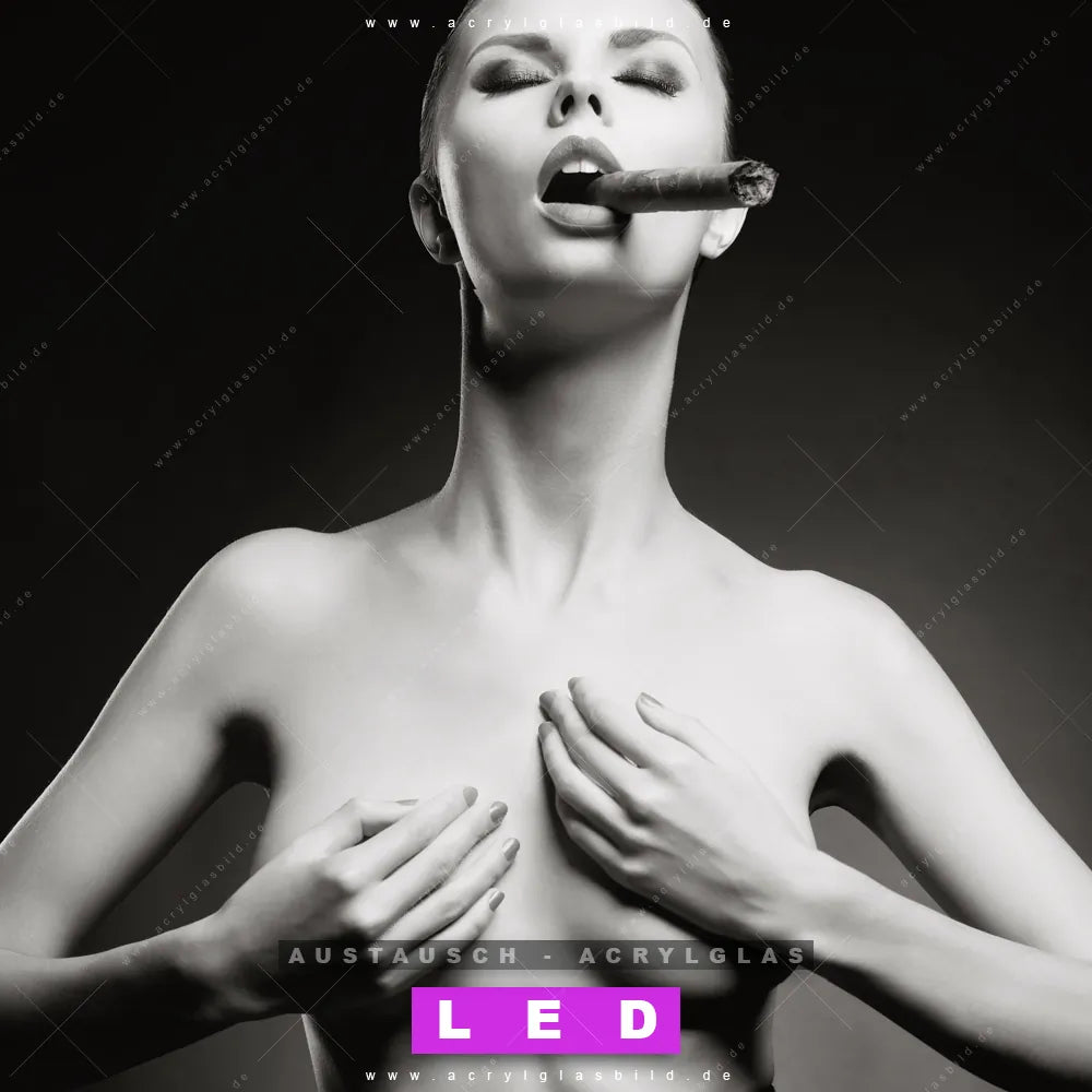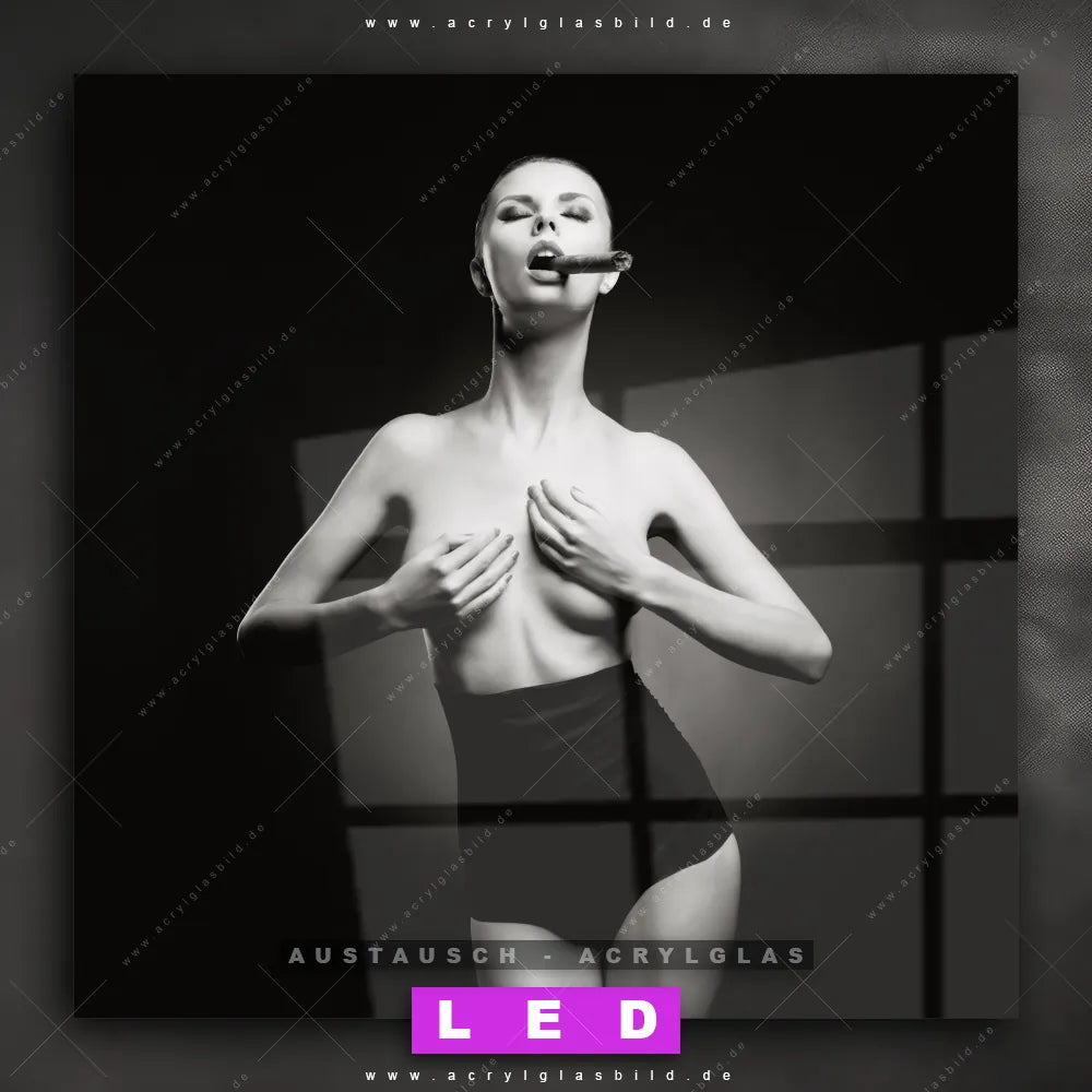 Begriffe wie Frau, Erotik, modern, sexy, rauchen, Zigarre, Körper, Akt haben dich auf der Suche nach deinem neuen Austausch-Acrylglasbild inspiriert? Dann sollte das Wechsel-Acrylglasbild halbnackte Frau mit Zigarre für dein bereits vorhandenes LED Acrylglasbild Canvalight® DIA den Weg zu dir finden.