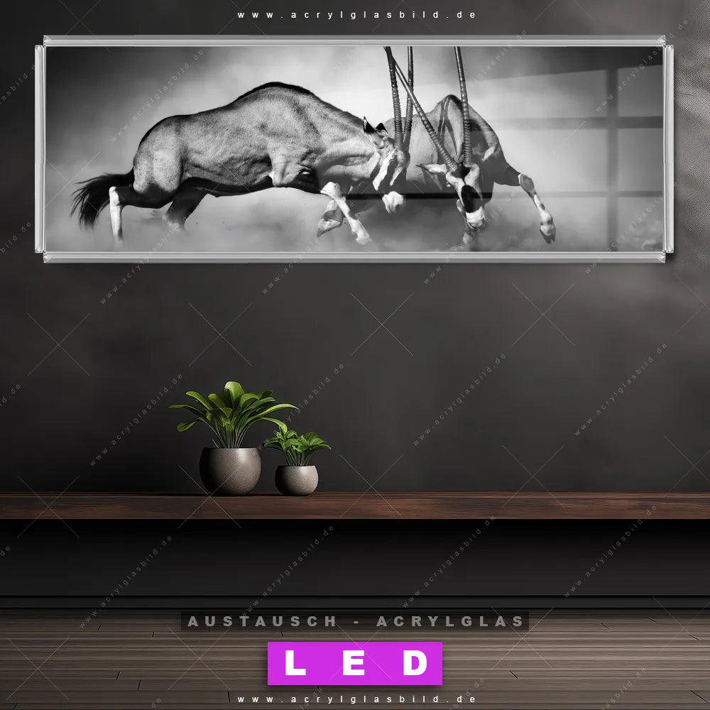 Begriffe wie Afrika, wild, Safari, Gemsen, Kampf, Duell, Staub, Hirsch haben dich auf der Suche nach deinem neuen Austausch-Acrylglasbild inspiriert? Dann sollte das Wechsel-Acrylglasbild Kampf der Wildtiere für dein bereits vorhandenes LED Acrylglasbild Canvalight® DIA den Weg zu dir finden.