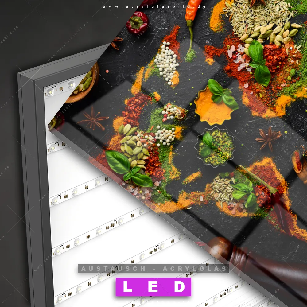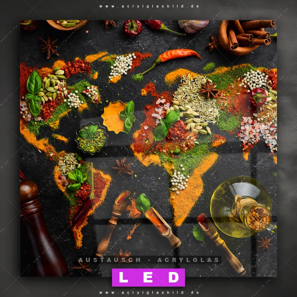 Begriffe wie Gewürze, Chili, Öl, Minze, Curry, Kräuter, Essen, Gesund, Pfeffermühle, Zimt, Sternanis haben dich auf der Suche nach deinem neuen Austausch-Acrylglasbild inspiriert? Dann sollte das Wechsel-Acrylglasbild Weltkarte aus Gewürzen für dein bereits vorhandenes LED Acrylglasbild Canvalight® DIA den Weg zu dir finden.