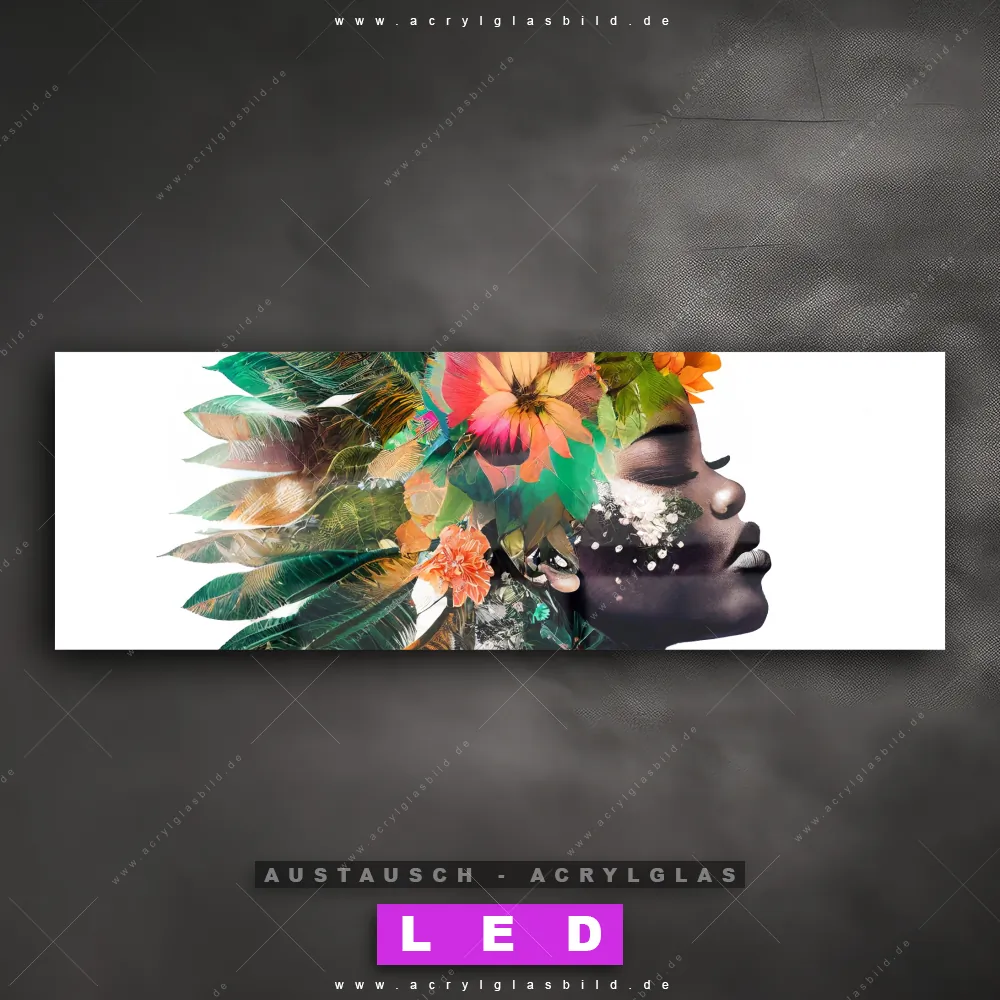Begriffe wie Menschen & Blumen, Frau, Porträt, Beauty, Gesicht, Blumen, Blüten, Blätter, Afrika haben dich auf der Suche nach deinem neuen Austausch-Acrylglasbild inspiriert? Dann sollte das Wechsel-Acrylglasbild Frau in Blütenpracht für dein bereits vorhandenes LED Acrylglasbild Canvalight® DIA den Weg zu dir finden.