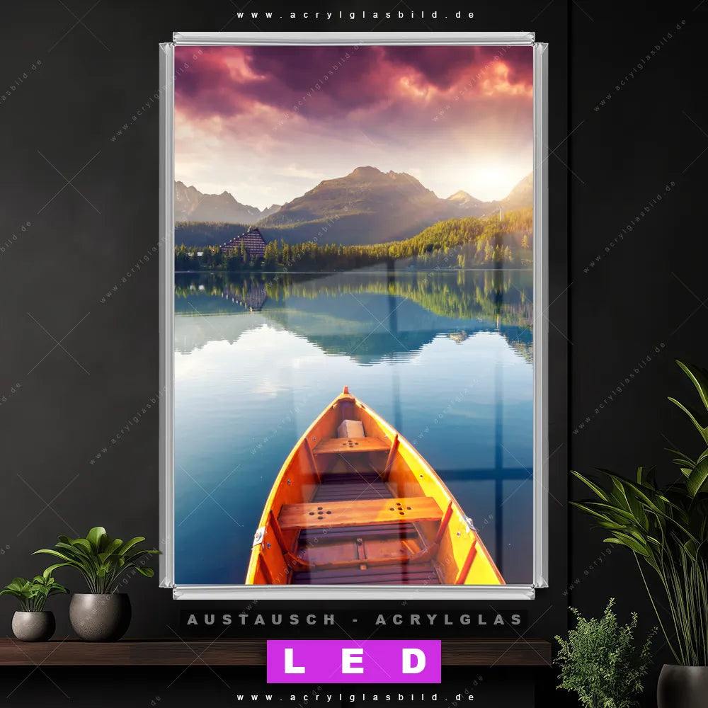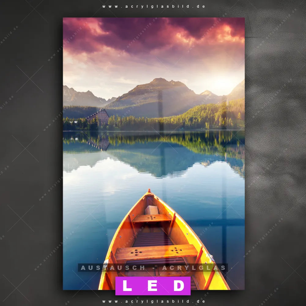 Begriffe wie Urlaub, Reisen, Wasser, Berge, Bergsee, See, Wasserspiegelung, Boote, Gebirge, Sonnenuntergang, Sonnenaufgang, Natur haben dich auf der Suche nach deinem neuen Austausch-Acrylglasbild inspiriert? Dann sollte das Wechsel-Acrylglasbild 3 Holzboote auf dem See in den Bergen für dein bereits vorhandenes LED Acrylglasbild Canvalight® DIA den Weg zu dir finden.
