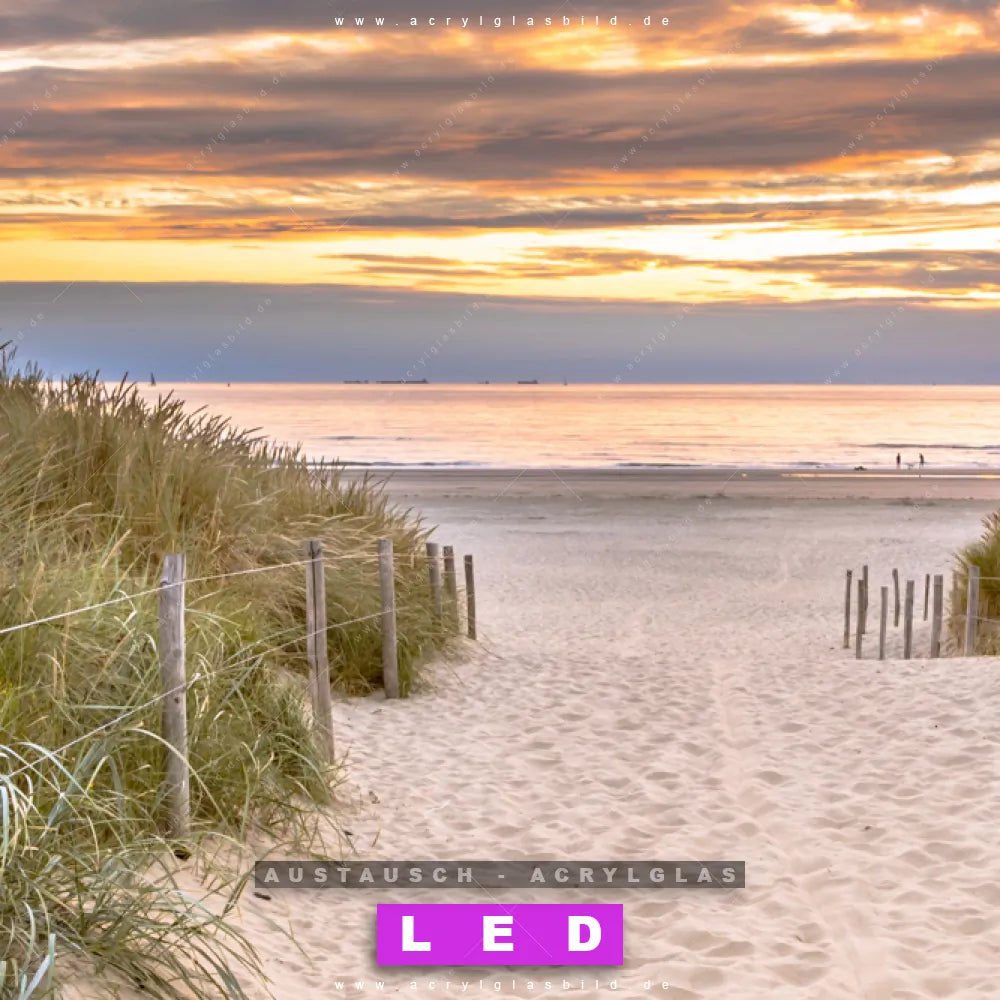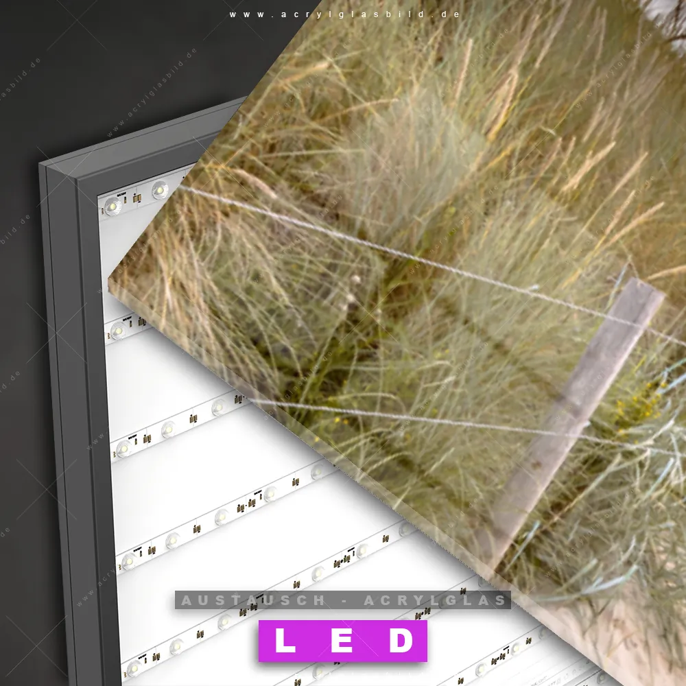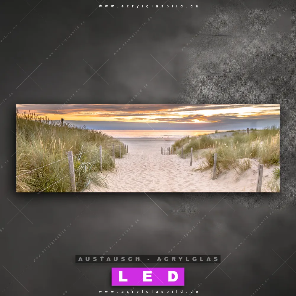 Begriffe wie Sommer, Deutschland, Dünen, Gräser, Sonnenuntergang - Sonnenaufgang, Ostsee - Nordsee, Urlaub - Reisen, Strandweg haben dich auf der Suche nach deinem neuen Austausch-Acrylglasbild inspiriert? Dann sollte das Wechsel-Acrylglasbild Weg zum Strand mit Gräsern für dein bereits vorhandenes LED Acrylglasbild Canvalight® DIA den Weg zu dir finden.